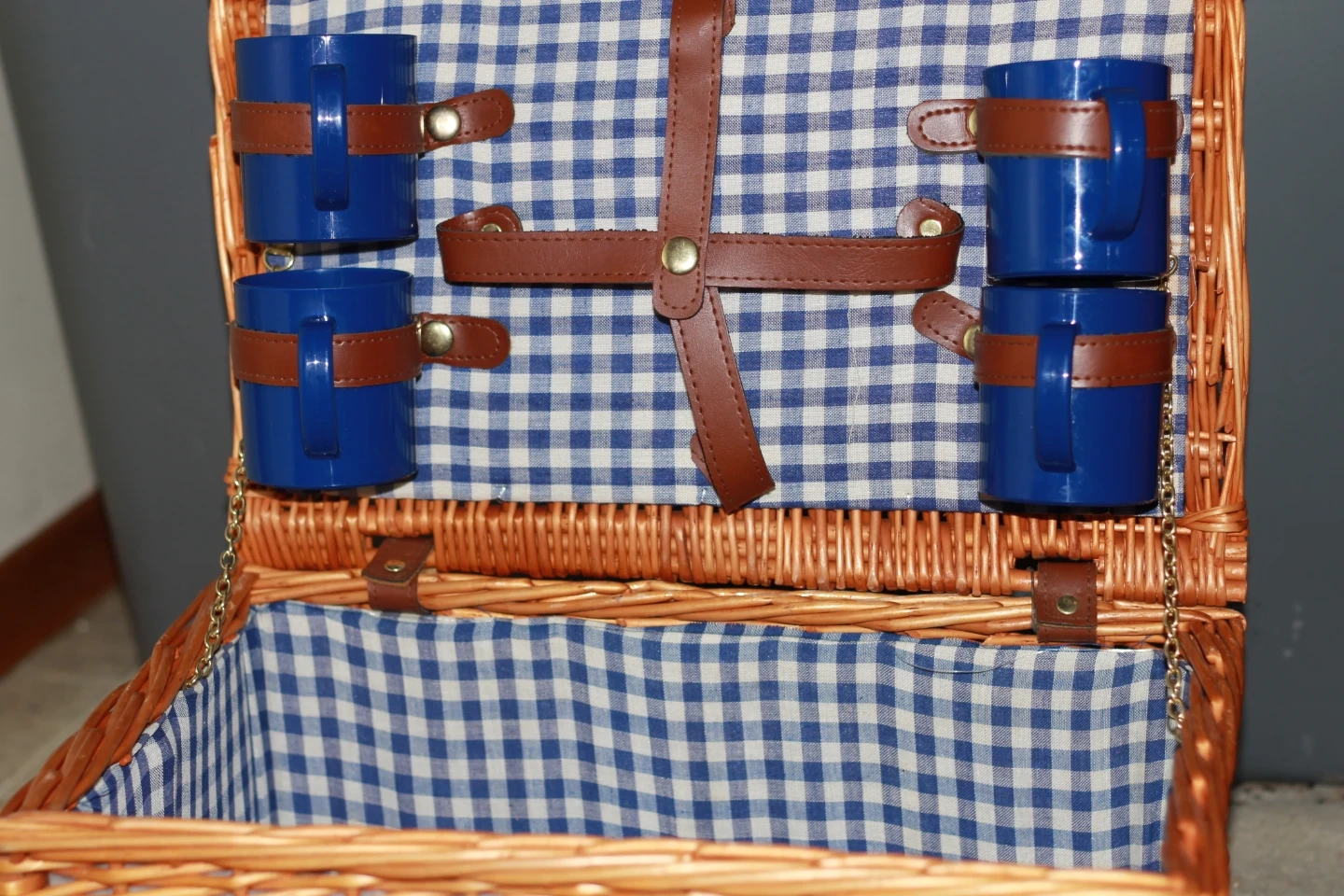 Wicker Picnic Basket with 4 Blue Cups
