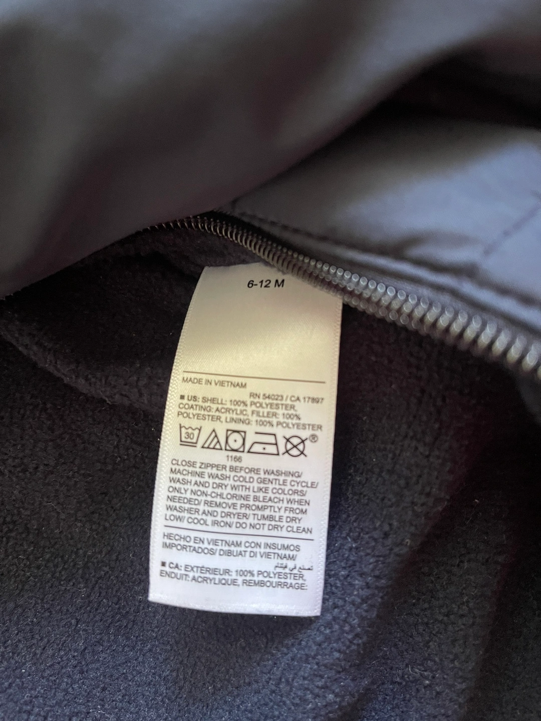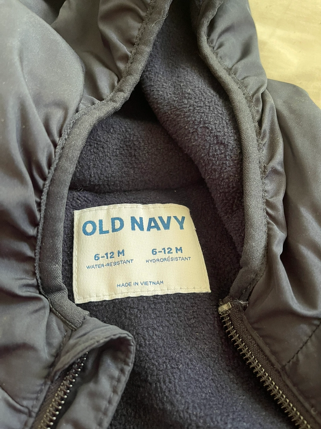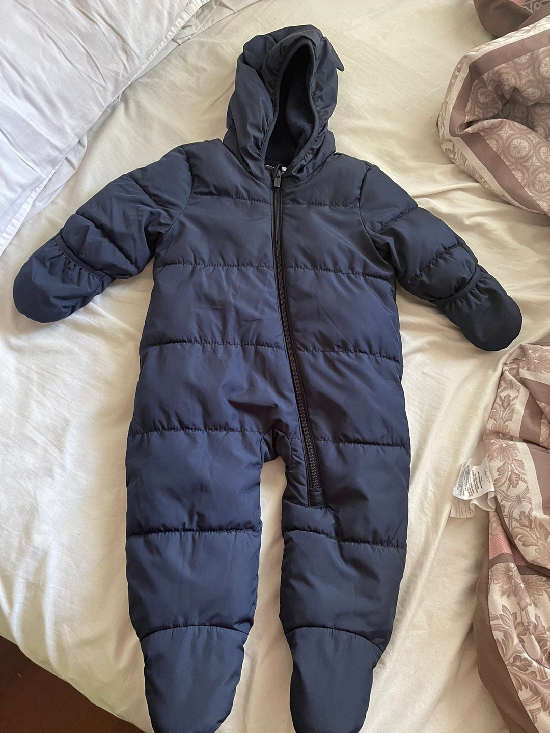 This is a blue snowsuit with a hood and zipper closure. The snowsuit is water-resistant. The snowsuit is in size 6-12 months.