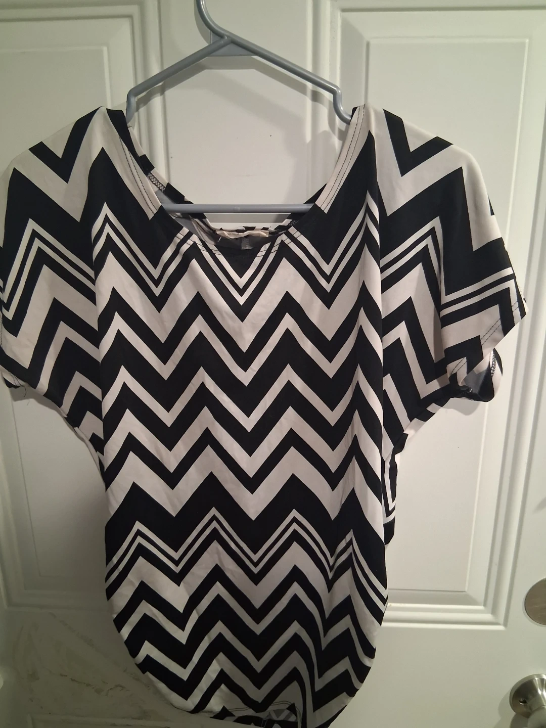 A black and white chevron print top with short sleeves. It's made of a lightweight fabric. Perfect for a casual day out!