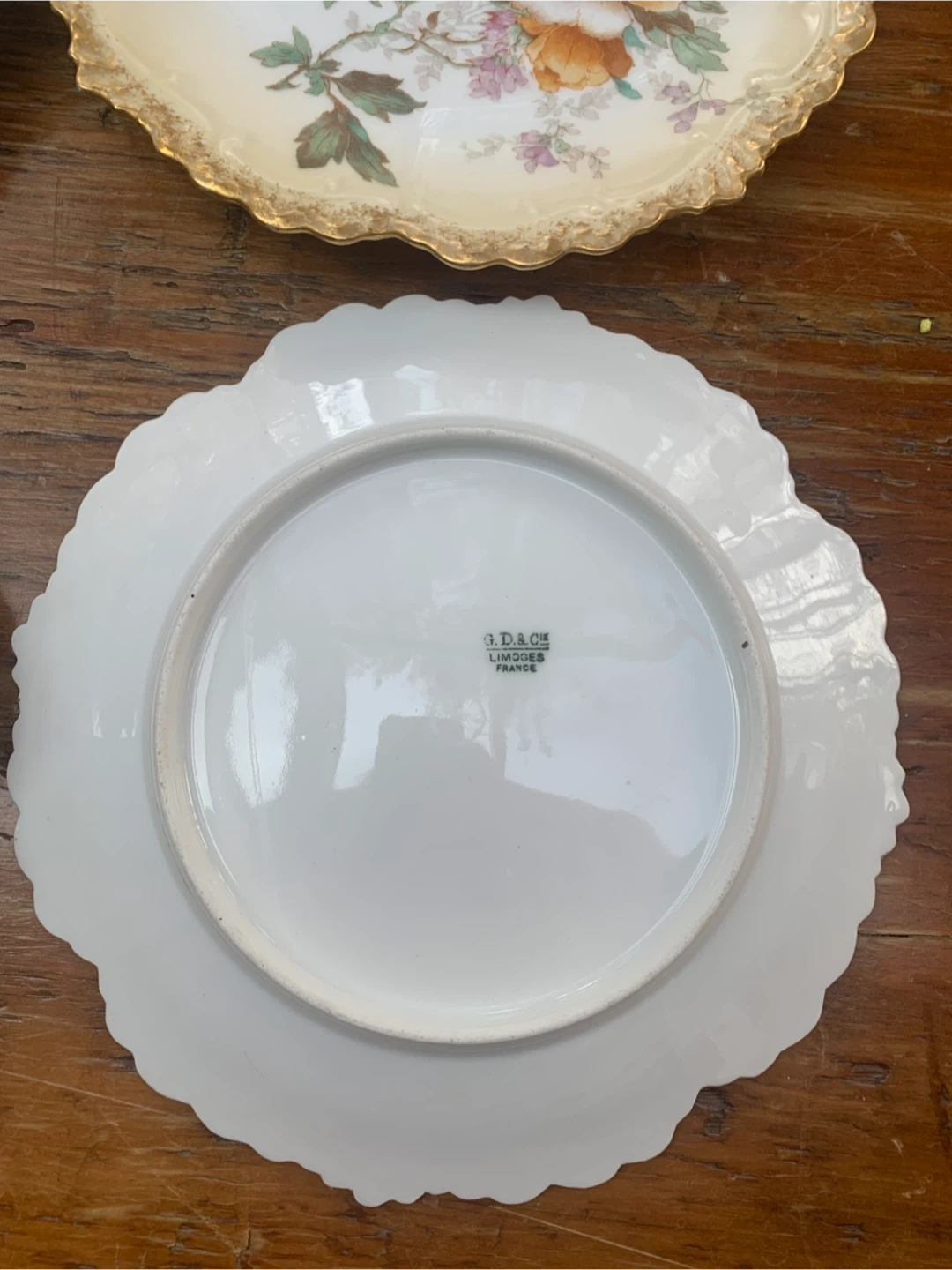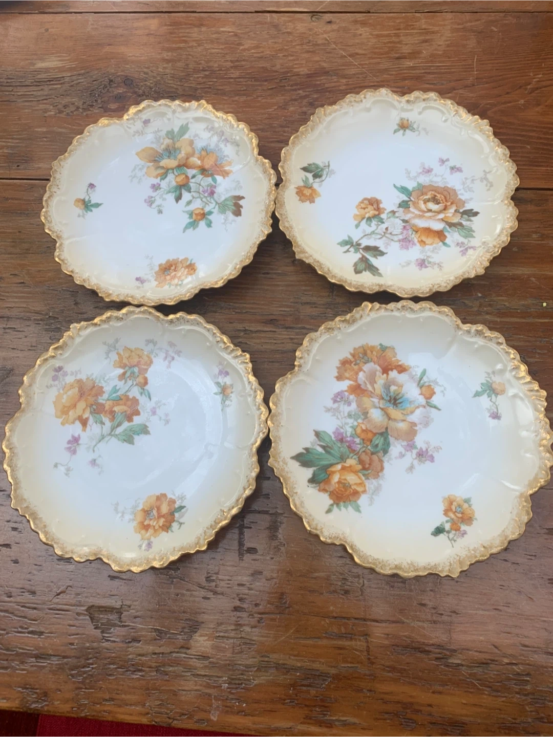 This is a set of four dessert plates from G.D.A Limoges, France. Each plate features a delicate floral design with hand-painted accents. They're finished with a scalloped edge and gold trim. These plates would be lovely for serving small desserts or as decorative pieces.