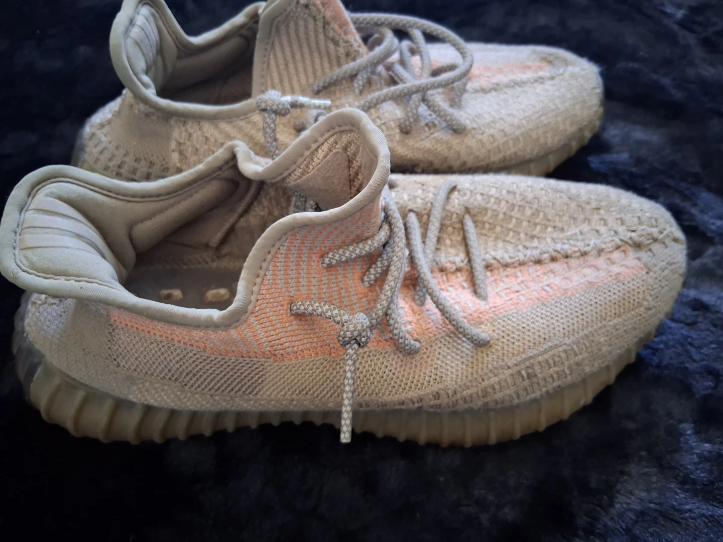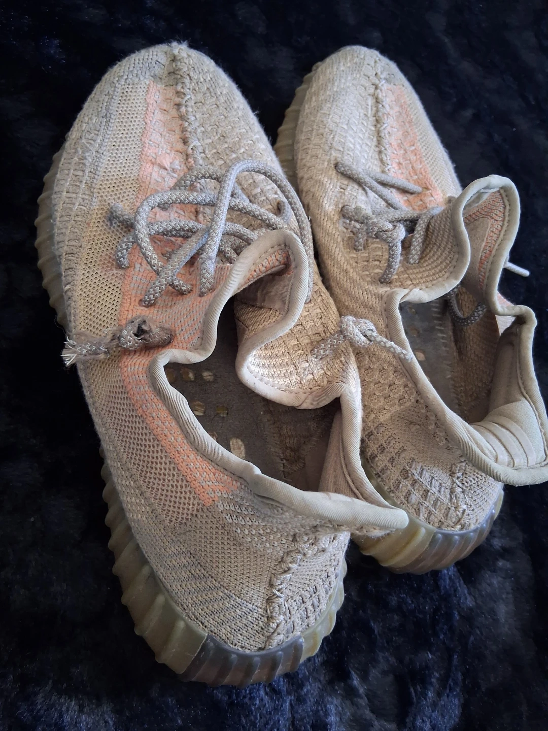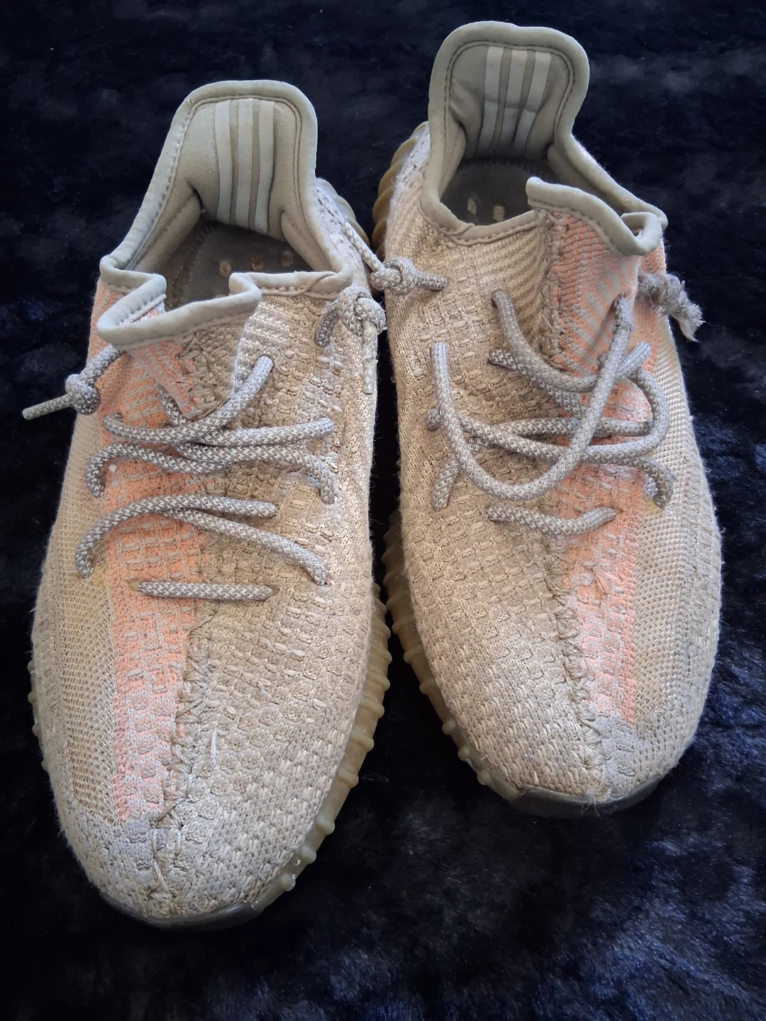 Pair of Adidas Yeezy Boost 350 V2 "Beluga Reflective" sneakers. Features a knit upper with pink and grey accents. These shoes are designed with a 'Boost' sole for comfort. They're a size 8½
