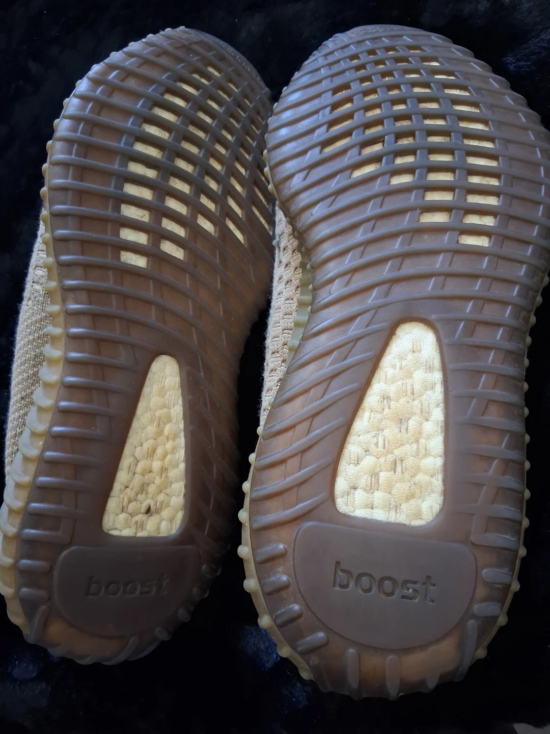 Pair of Adidas Yeezy Boost 350 V2 "Beluga Reflective" sneakers. Features a knit upper with pink and grey accents. These shoes are designed with a 'Boost' sole for comfort. They're a size 8½