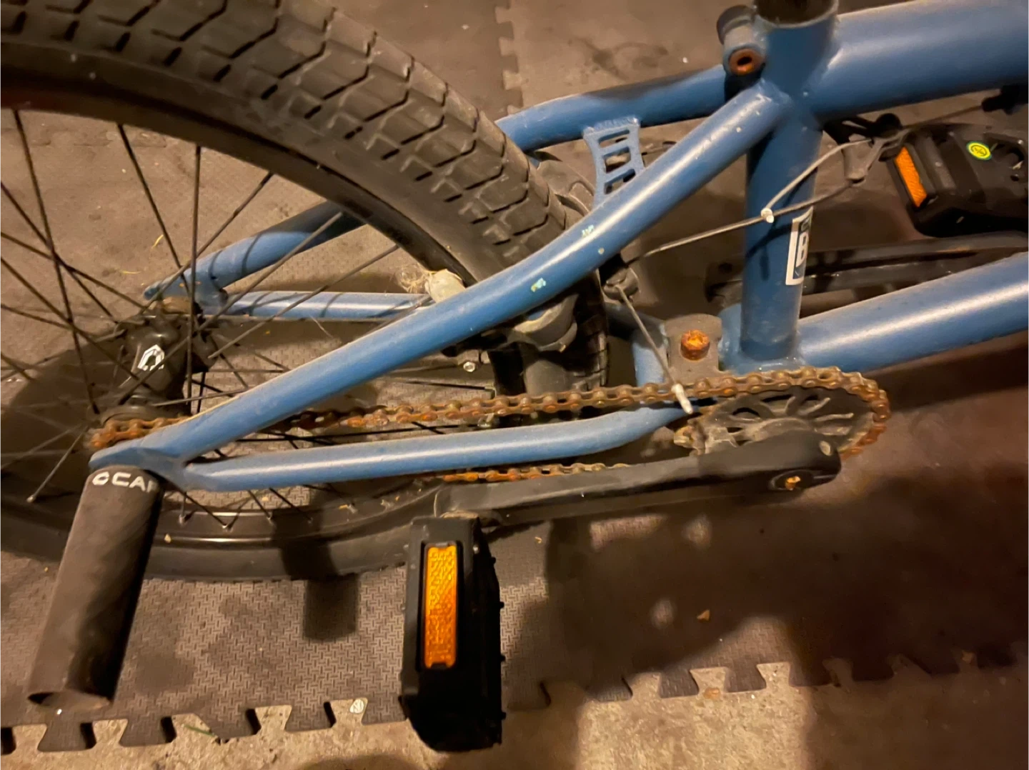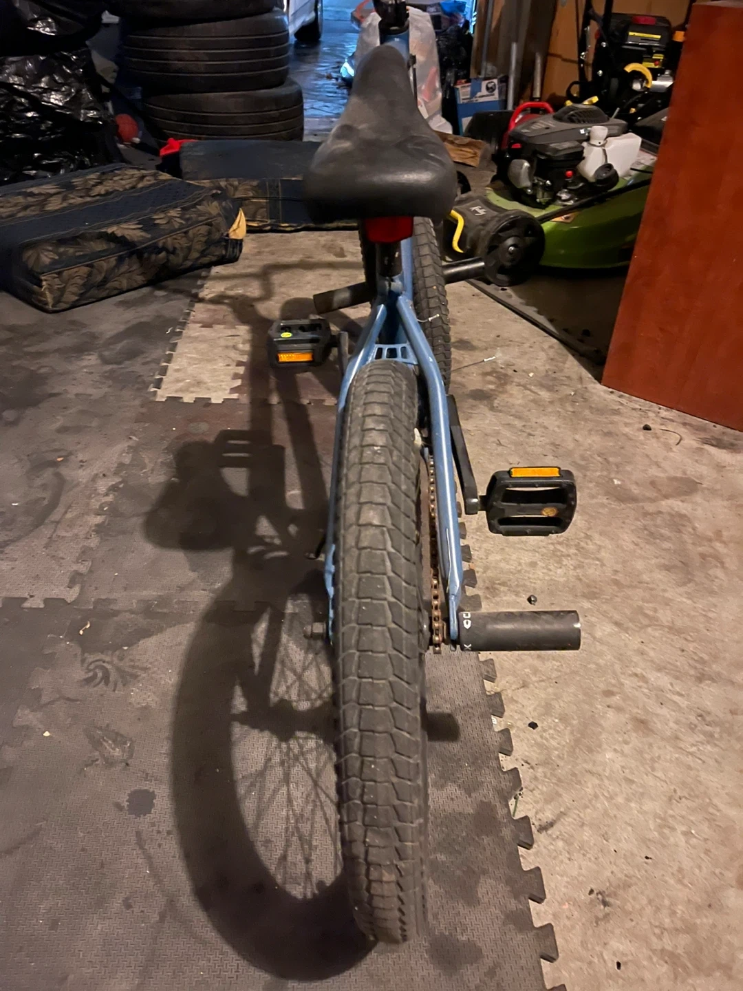 Blue Felt BMX bike with black handlebars and seat. It has black pedals and a kickstand. It's a fun bike for riding around!