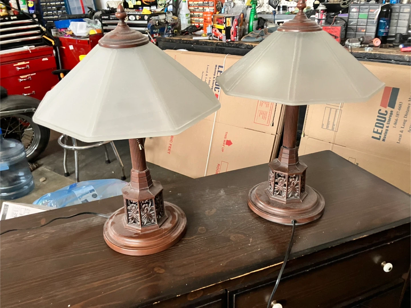 Selling a pair of decorative table lamps. They have frosted glass shades and ornate dark wood-toned bases. Both lamps are in good working condition.