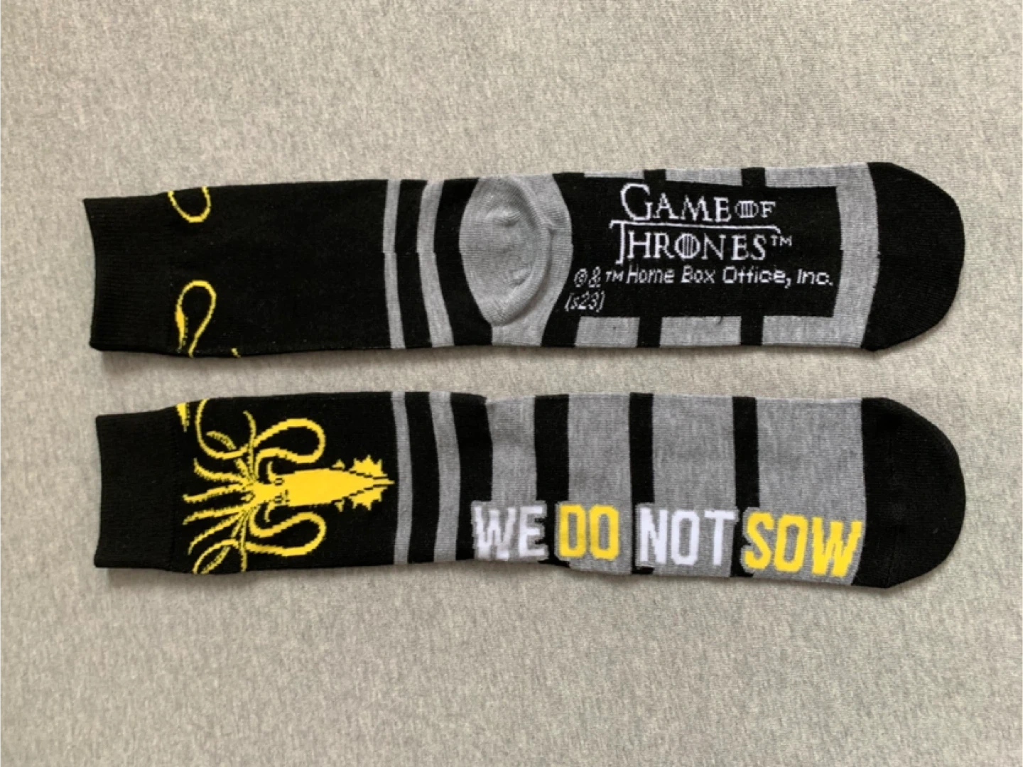 These are Game of Thrones socks featuring the Greyjoy house sigil and "We Do Not Sow" slogan. They're black with grey and yellow accents.