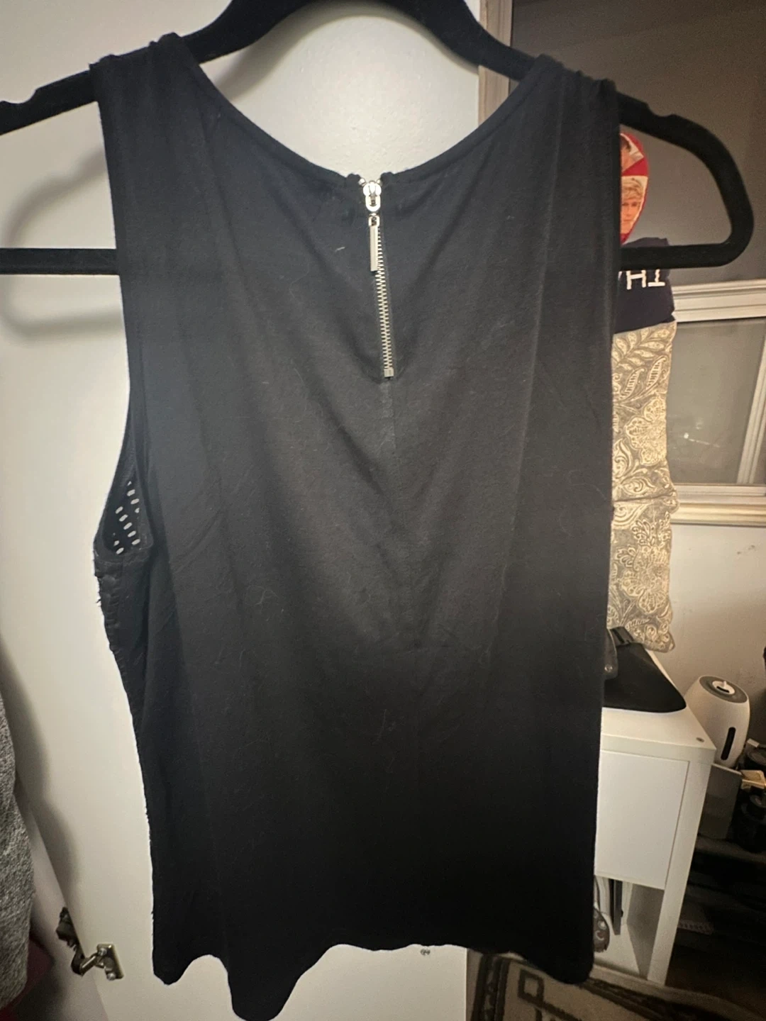 Black sleeveless tank top from Red Coral Collections. It has a perforated overlay and a zipper closure in the back. Size L.