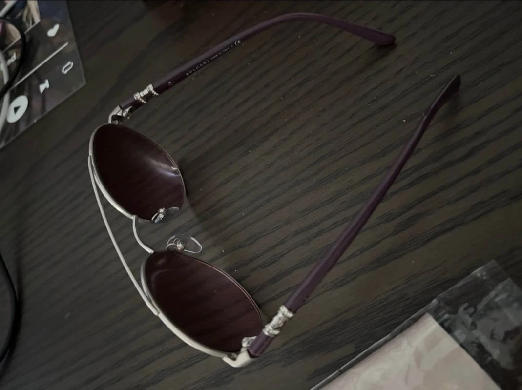Stylish BVLGARI sunglasses with a silver and purple frame. They come with the original case and cleaning cloth. Made in Italy. Perfect for protecting your eyes in the sun! 100% AUTHENTIC!
