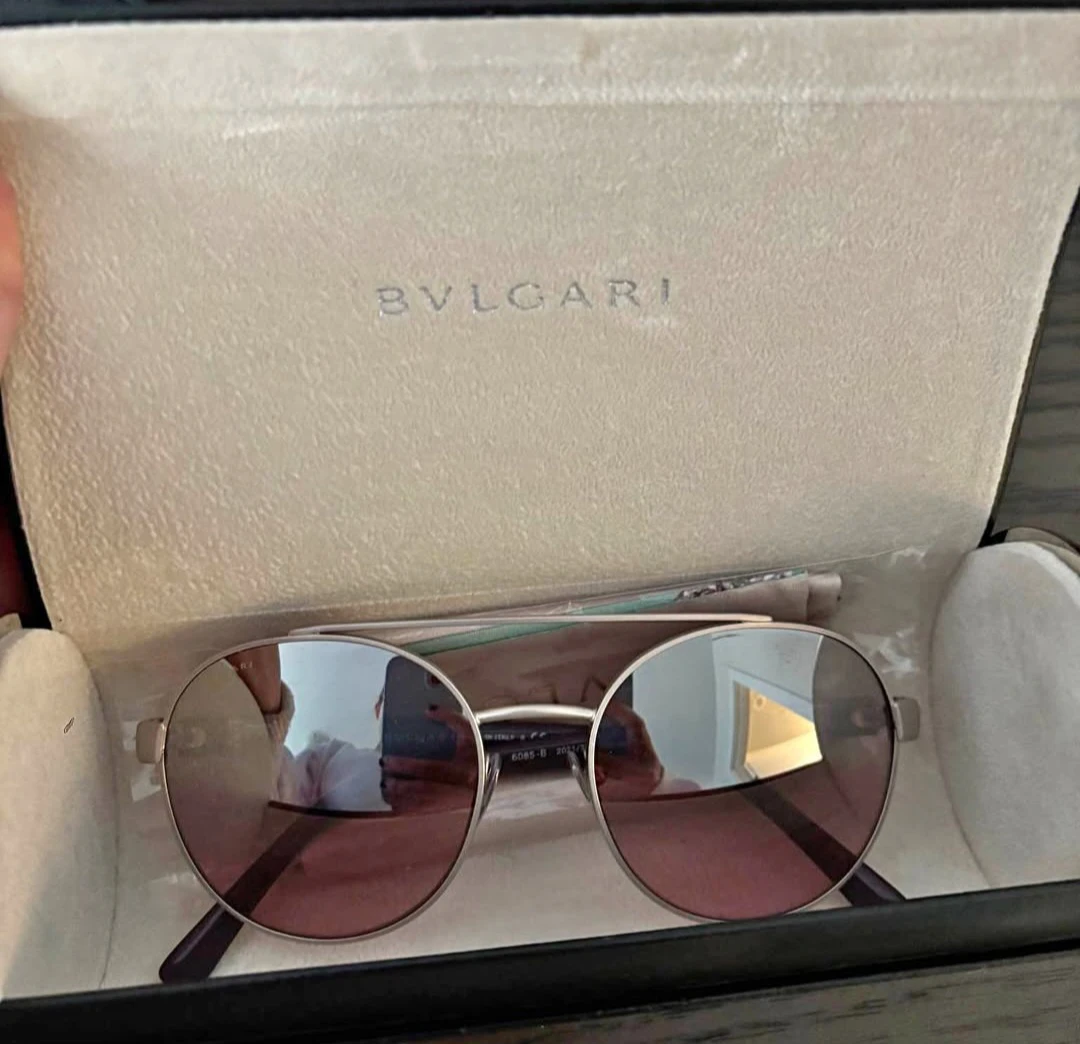 Stylish BVLGARI sunglasses with a silver and purple frame. They come with the original case and cleaning cloth. Made in Italy. Perfect for protecting your eyes in the sun! 100% AUTHENTIC!