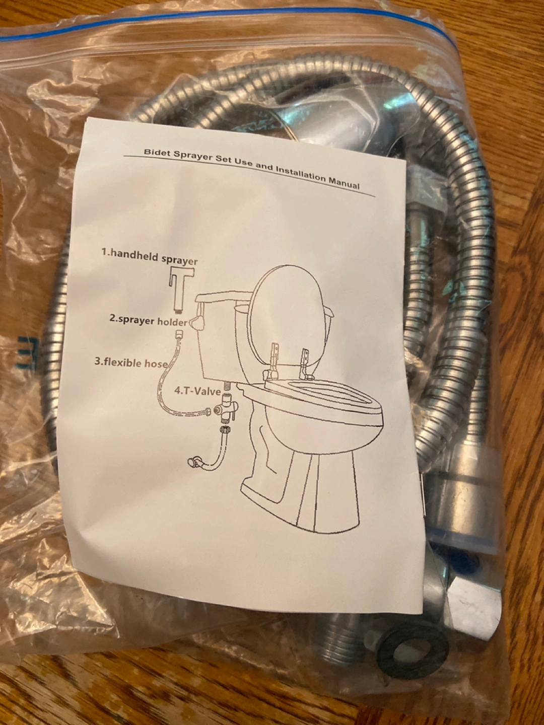 Complete bidet sprayer set. Includes handheld sprayer, holder, flexible hose, and T-valve. Silver finish. Never used.