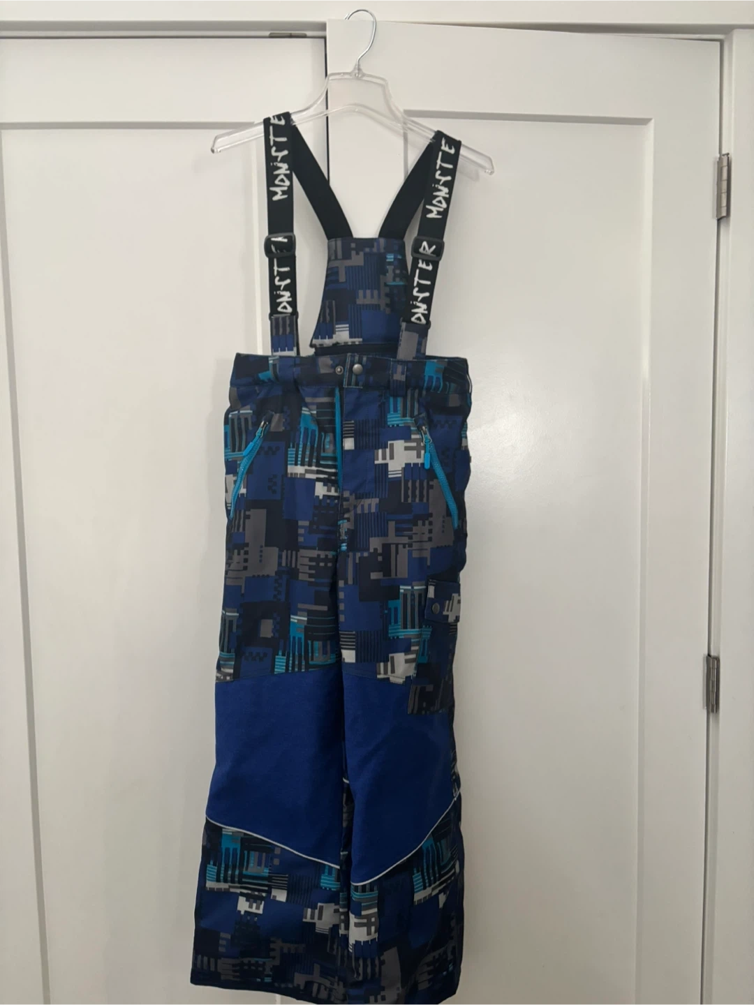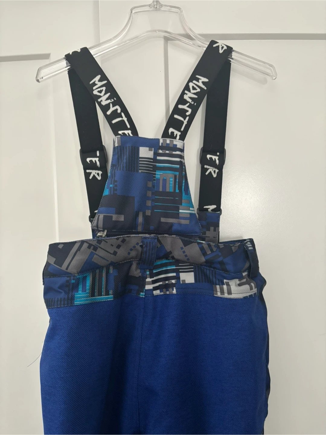 Selling a Monster snowsuit and jacket set for kids, size 12! The snowsuit is blue with a cool geometric pattern and adjustable straps. The jacket is a matching blue, grey, and navy colour block design. Perfect for keeping your little one warm and stylish on the slopes or during winter activities