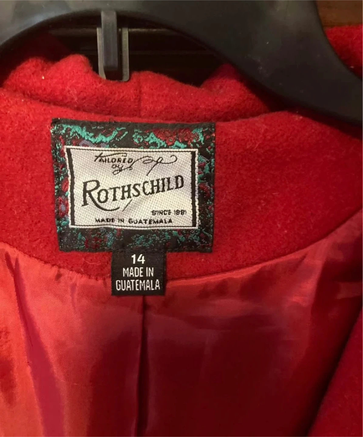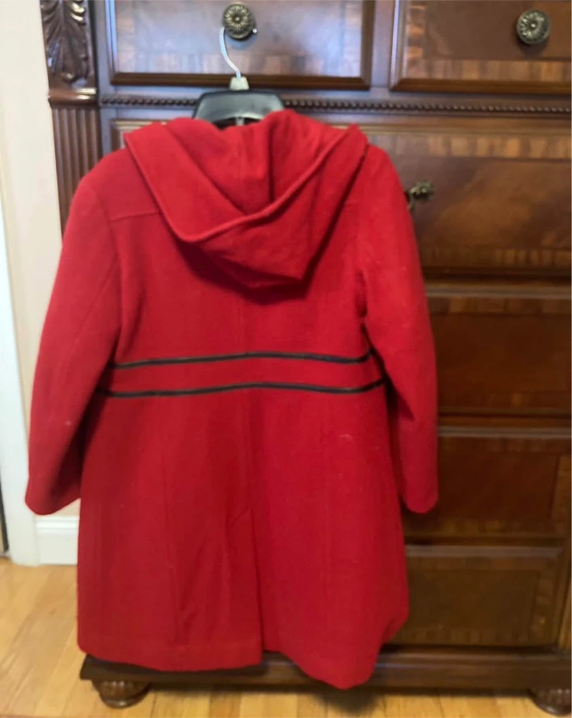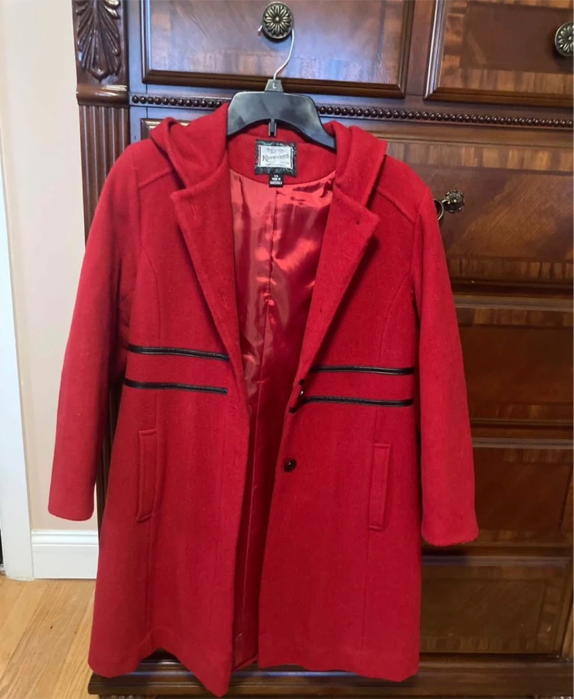 This is a Rothschild red hooded coat. It's a size 14 and made in Guatemala. Features black trim detailing along the front and back waist.