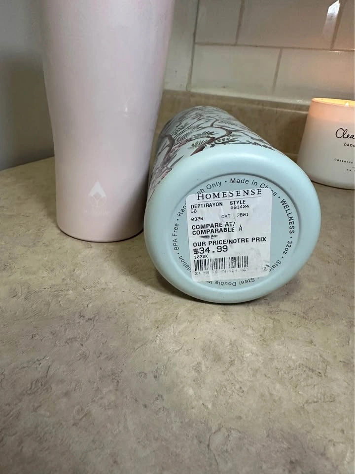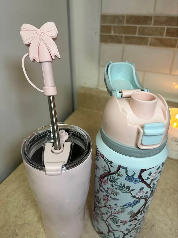 Cute Wellness water bottle and tumbler set. Blue bottle has pretty floral and bird design, is 32oz, with a flip-top lid. Pink tumbler has a textured pattern, comes with a metal straw and a cute bow straw topper. Both are BPA free. Great for staying hydrated!