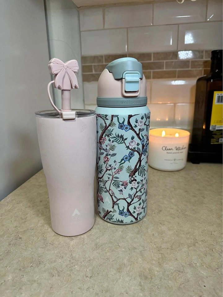 Cute Wellness water bottle and tumbler set. Blue bottle has pretty floral and bird design, is 32oz, with a flip-top lid. Pink tumbler has a textured pattern, comes with a metal straw and a cute bow straw topper. Both are BPA free. Great for staying hydrated!