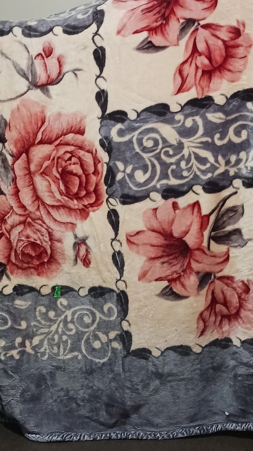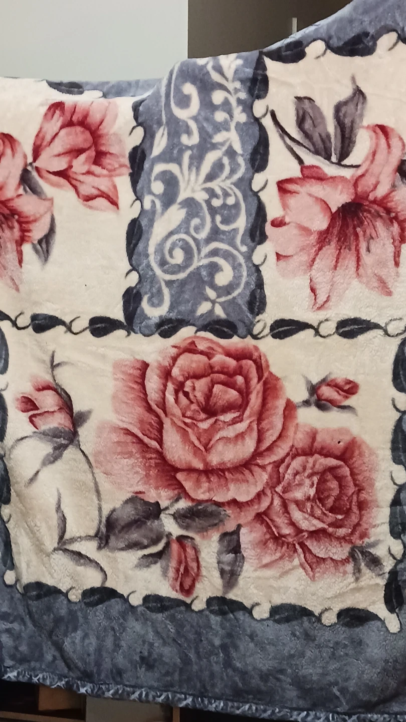 A cozy blanket featuring a beautiful floral rose design. It's soft and warm, perfect for snuggling up on the couch. The patterned squares are framed by a grey border. Light weight and beautiful in any setting!