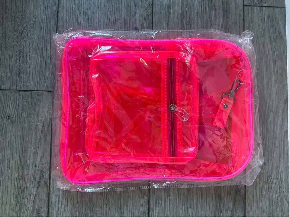 Soccer Goal Themed Pop-Up Bag: Features a bold red transparent body decorated with soccer graphics, including a goal, a soccer ball, and a "GOOOAAL!" slogan. Utilizes a flexible, circular frame for easy expansion and flat storage. Accented with a multi-colored rainbow rim and star patterns. Includes integrated red straps for easy carrying or hanging. Transparent Neon Pink Backpack: Made from a bright, neon pink transparent material for a trendy look and easy content identification. Features a large main compartment and a smaller zippered front pocket for better organization. Equipped with matching transparent pink shoulder straps and adjustable metal buckles for a customized fit. Includes a top zipper and a built-in metal clip for attaching keys or accessories.