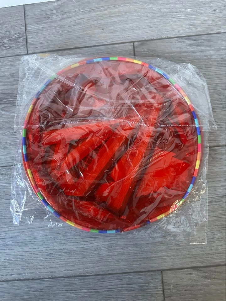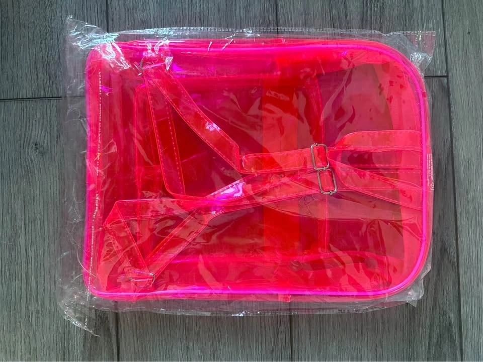 Soccer Goal Themed Pop-Up Bag: Features a bold red transparent body decorated with soccer graphics, including a goal, a soccer ball, and a "GOOOAAL!" slogan. Utilizes a flexible, circular frame for easy expansion and flat storage. Accented with a multi-colored rainbow rim and star patterns. Includes integrated red straps for easy carrying or hanging. Transparent Neon Pink Backpack: Made from a bright, neon pink transparent material for a trendy look and easy content identification. Features a large main compartment and a smaller zippered front pocket for better organization. Equipped with matching transparent pink shoulder straps and adjustable metal buckles for a customized fit. Includes a top zipper and a built-in metal clip for attaching keys or accessories.