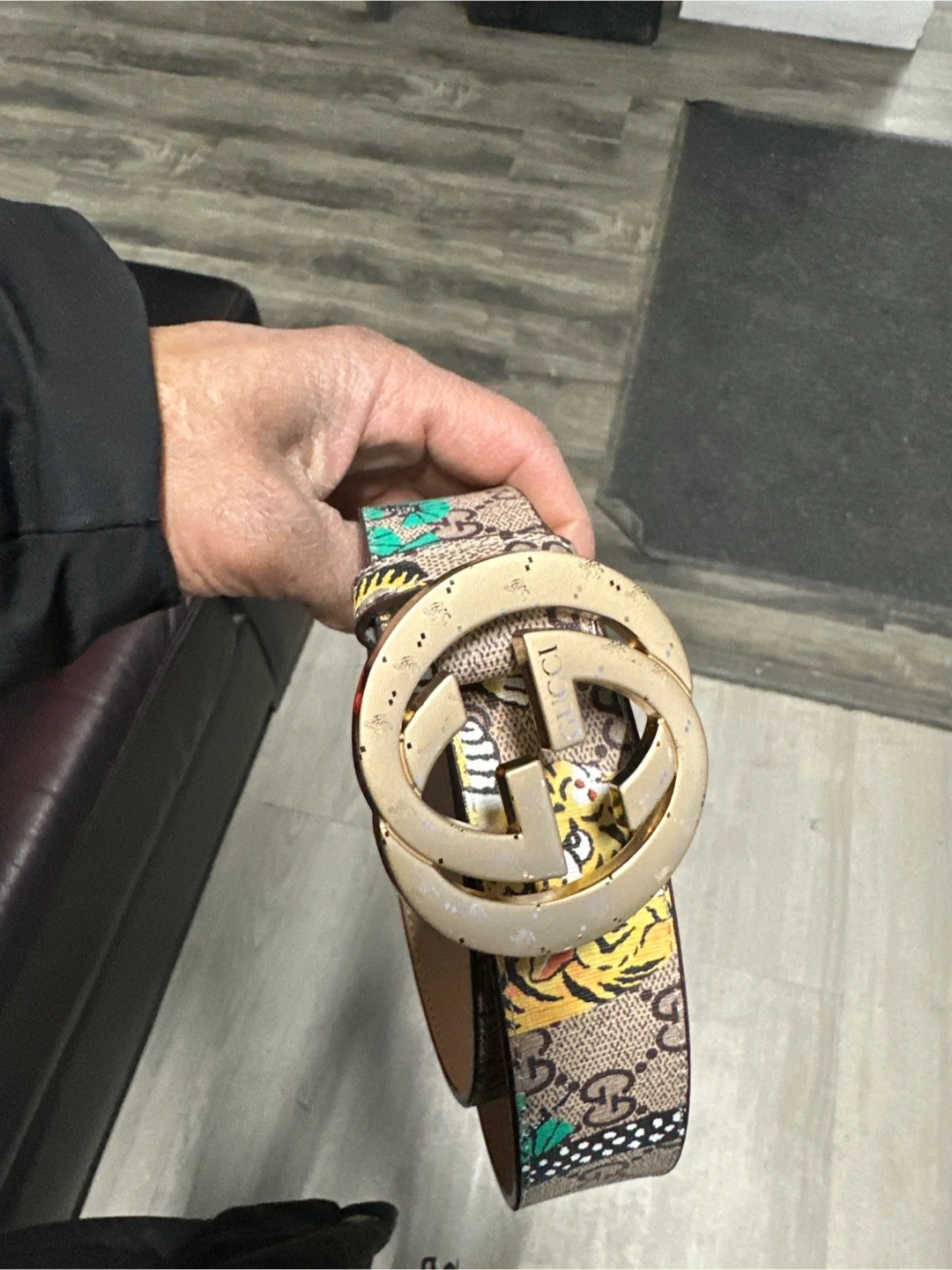 Selling a Gucci belt with a unique tiger print design! The belt features the iconic Gucci logo buckle. It shows some signs of wear on the buckle, as seen in the photos, but still has lots of life left