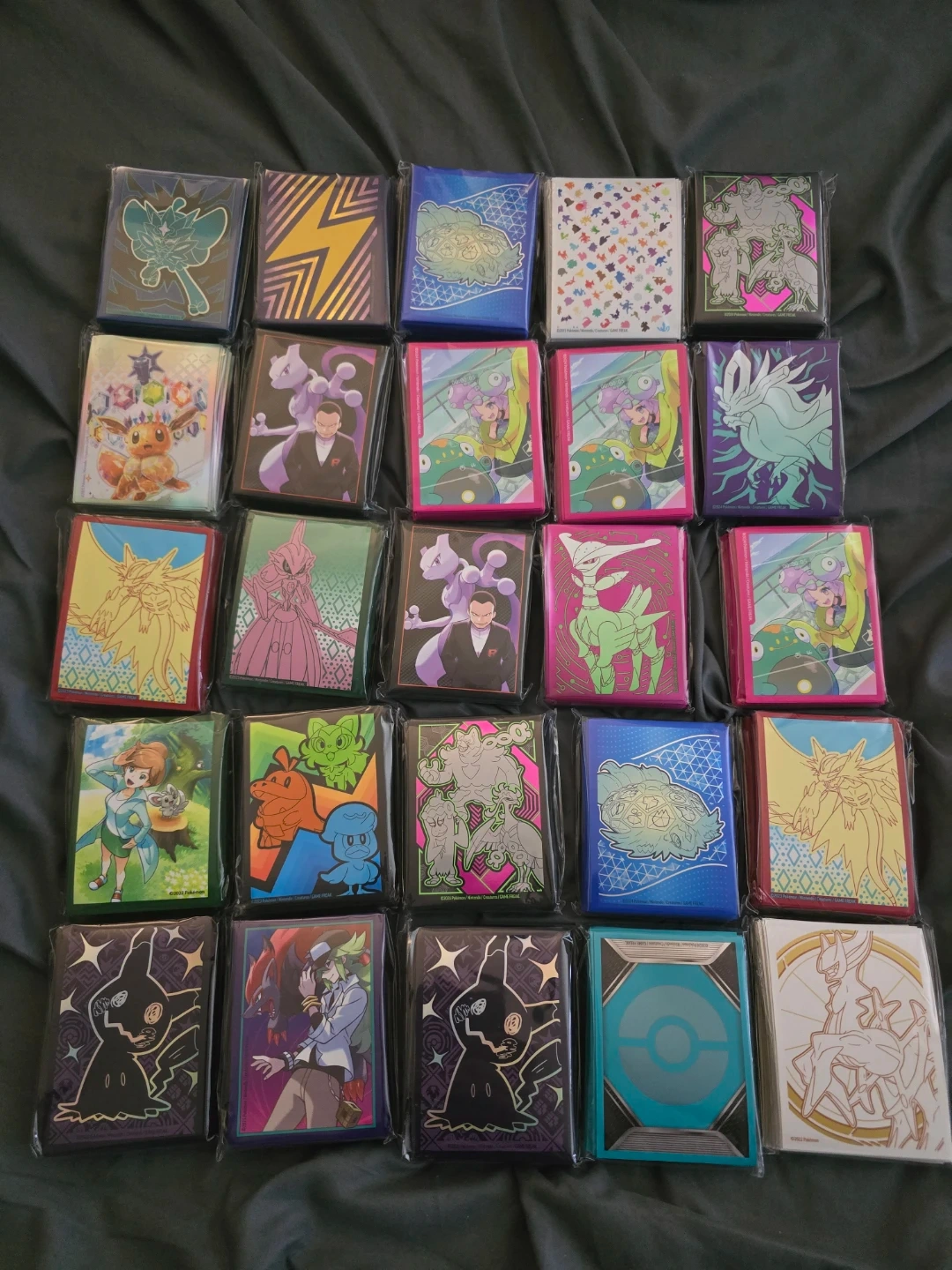 Deck of assorted Pokemon card sleeves. Features various Pokemon characters and designs. Protects your cards from damage.