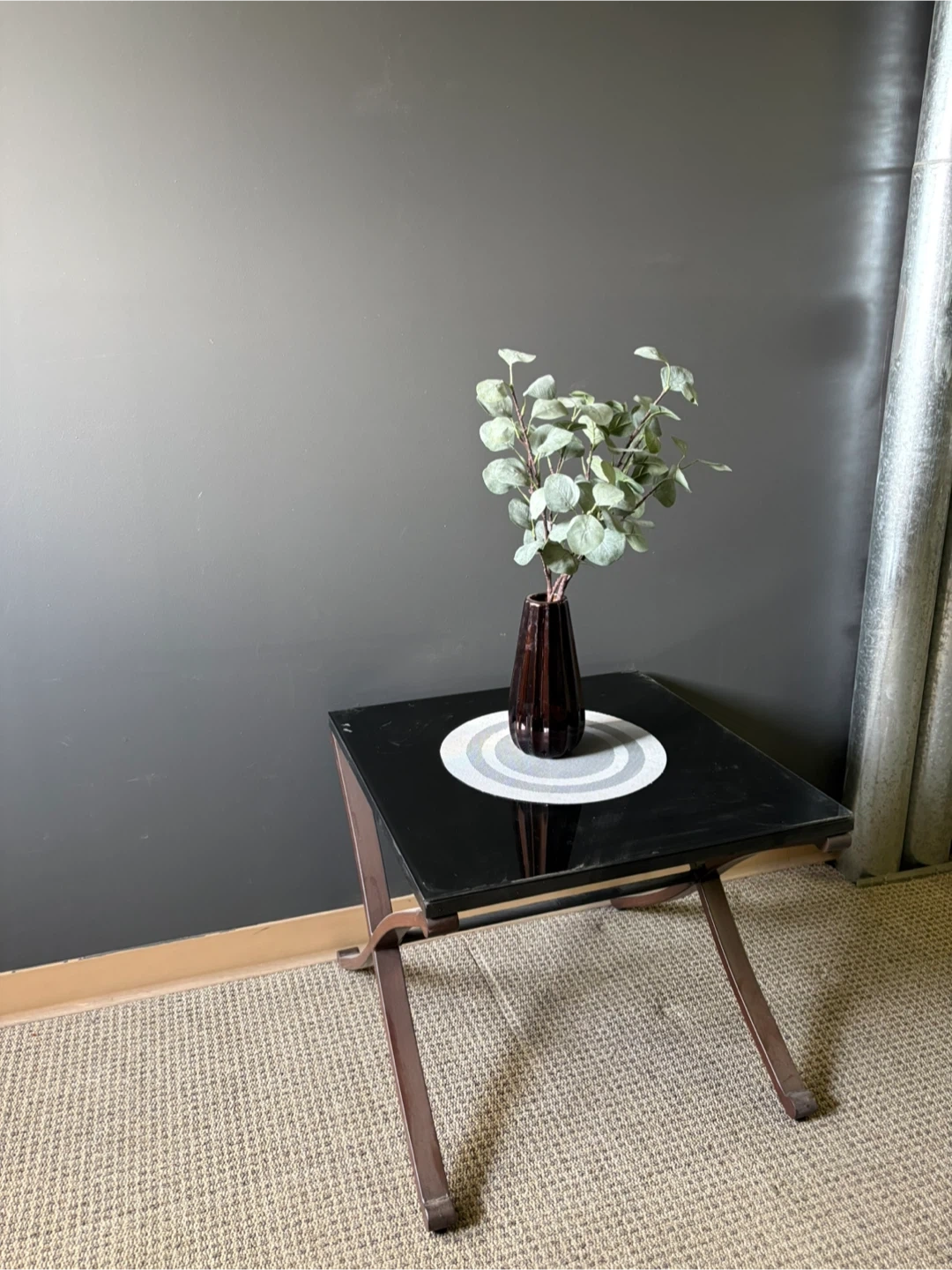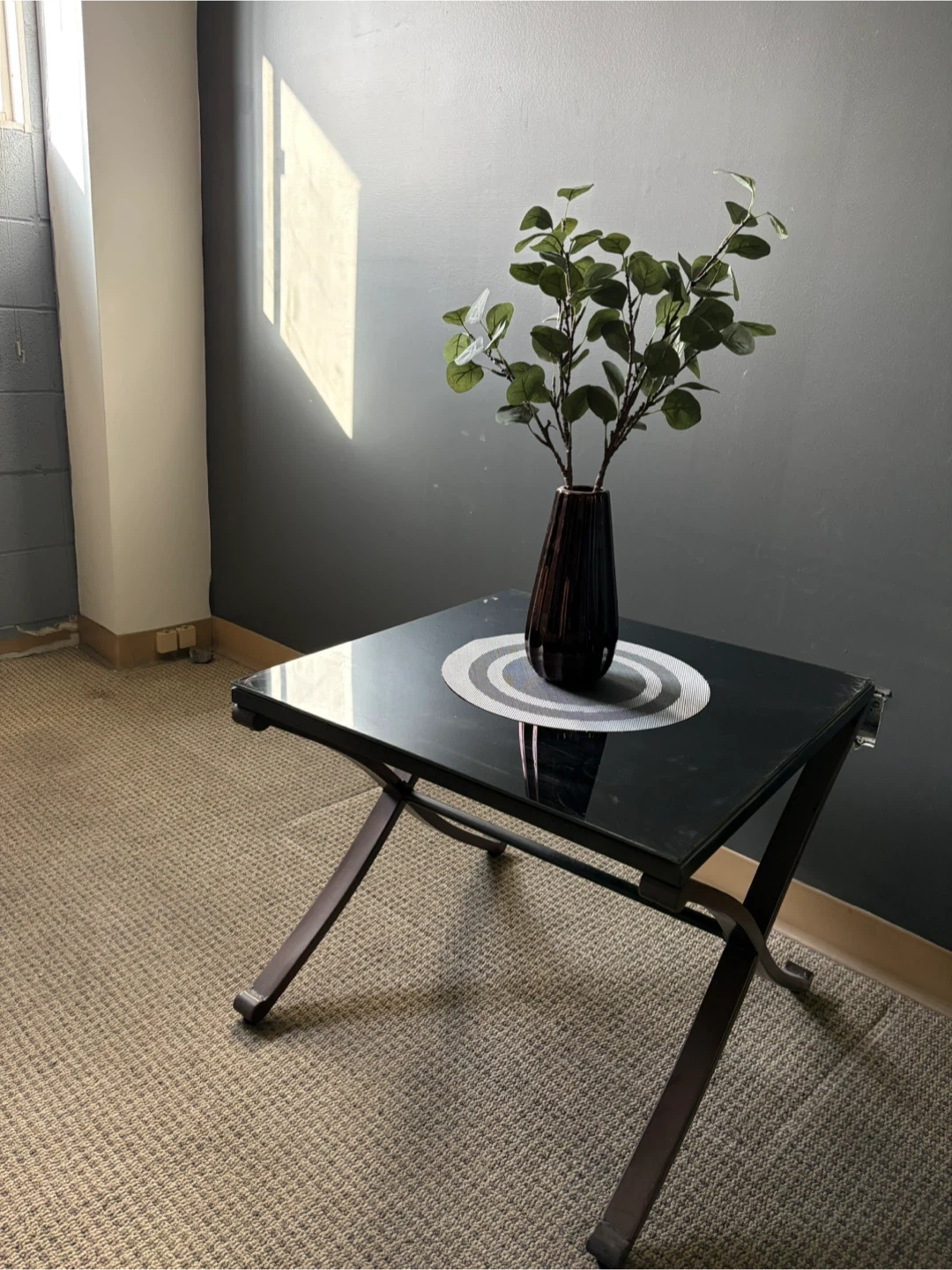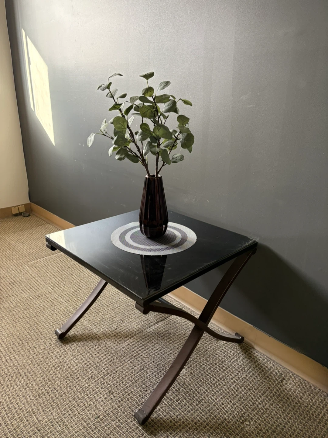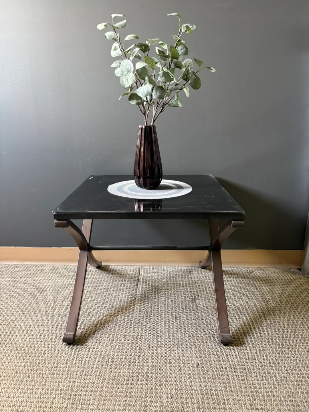 A stylish side table with a glossy black glass top and a unique X-shaped metal frame. Made with tempered glass.