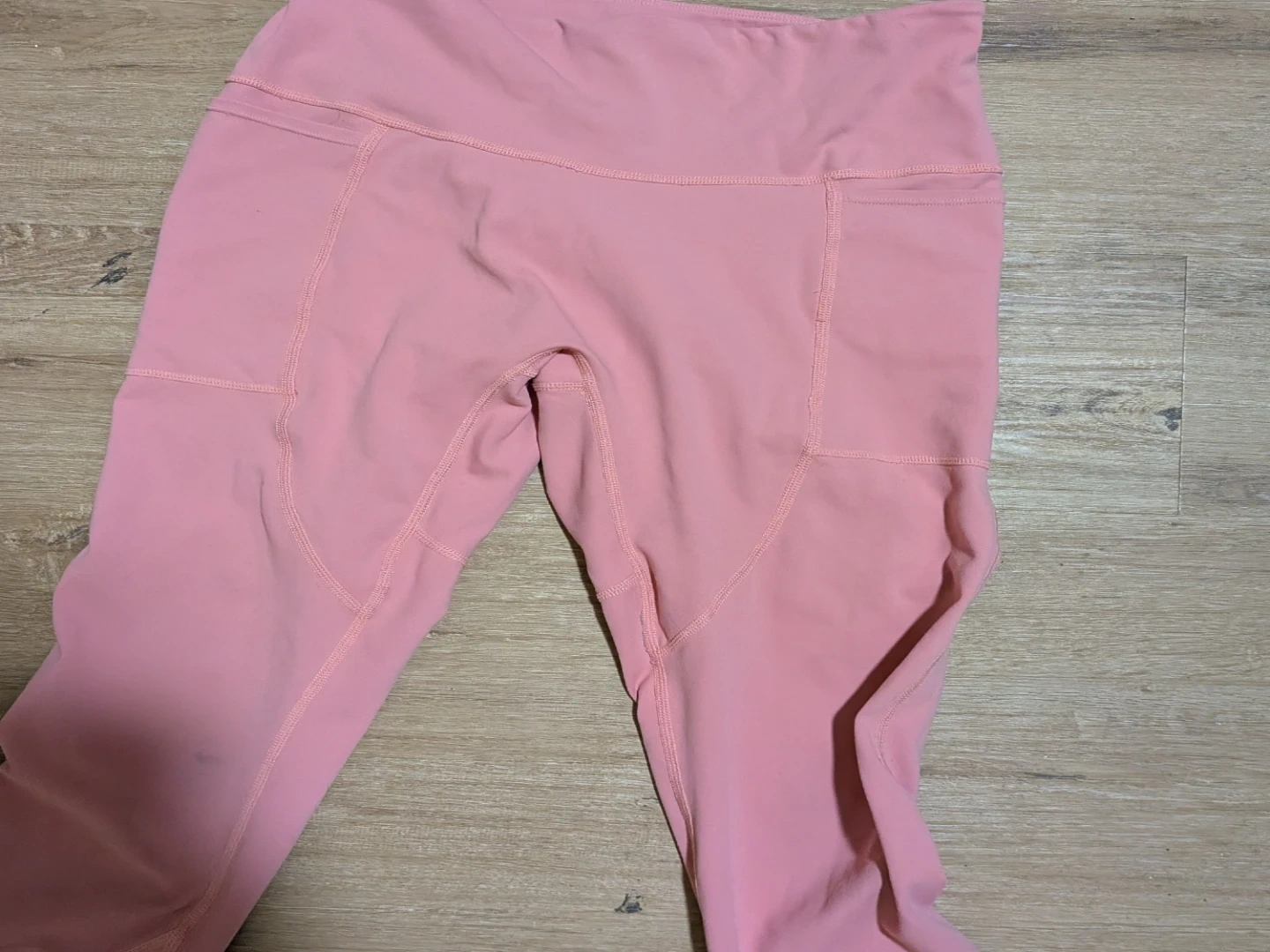 These are pink athletic leggings with side pockets. They're made of a stretchy material. Pockets are handy for your phone or keys!