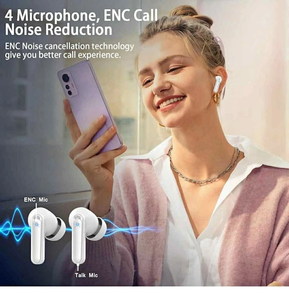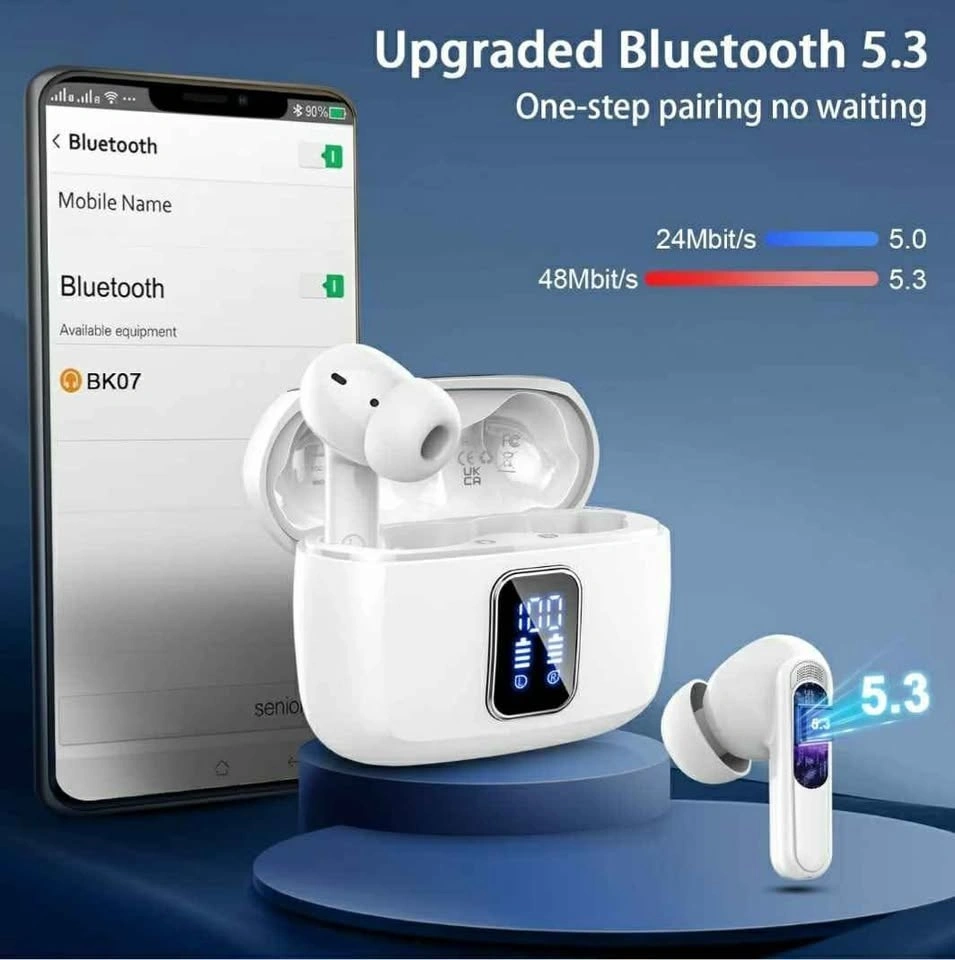 These are new wireless earbuds featuring Bluetooth 5.3, HiFi stereo sound, and 4 ENC noise-cancelling microphones. They offer 48 hours of playback, are IP7 waterproof, and come with USB-C charging and an LED display. Great for sports. Color: White. Located in Crowsnest Pass.