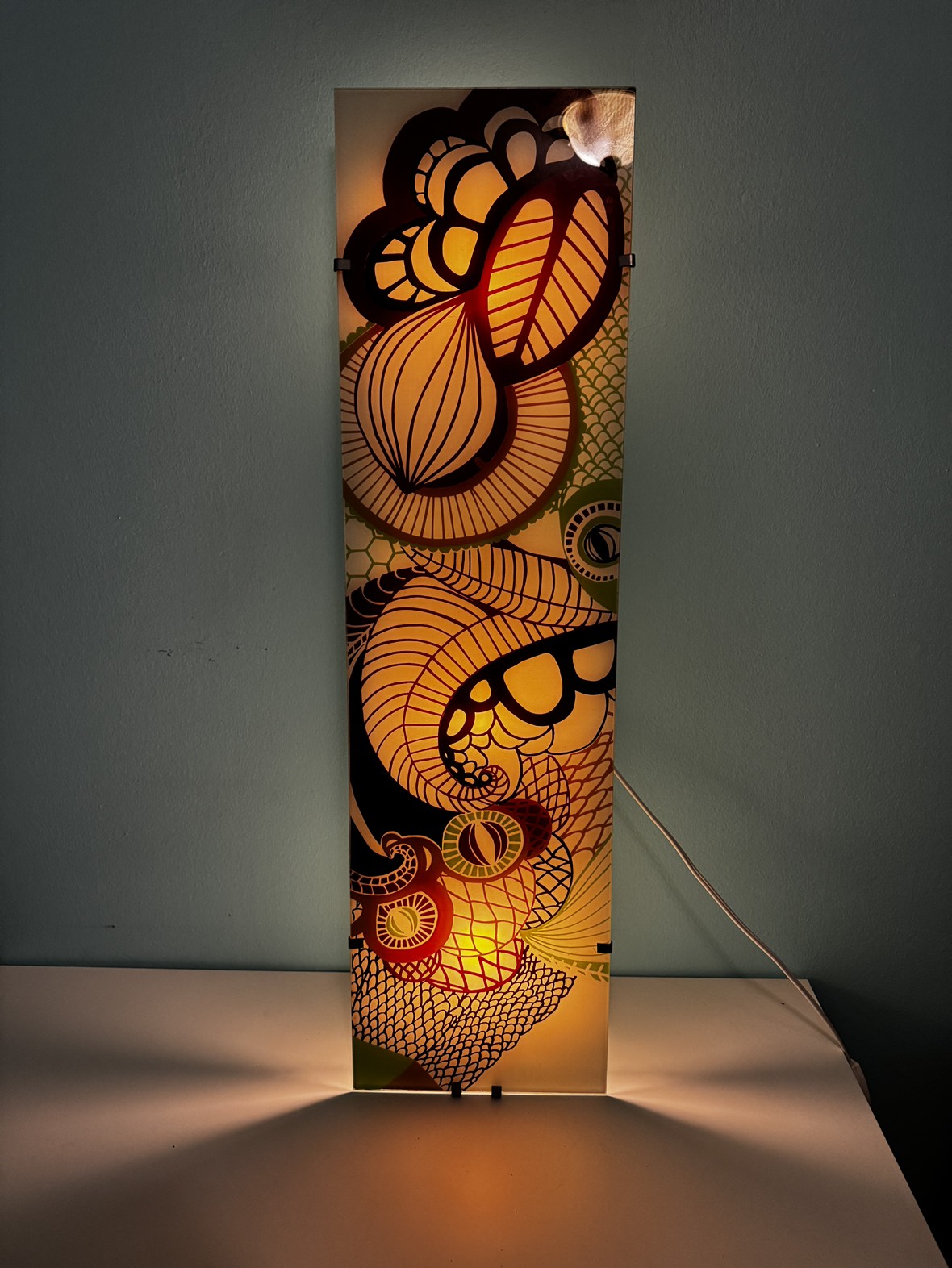 It looks very nice. It’s the dark dragon design on the glass comes with four lightbulbs included.