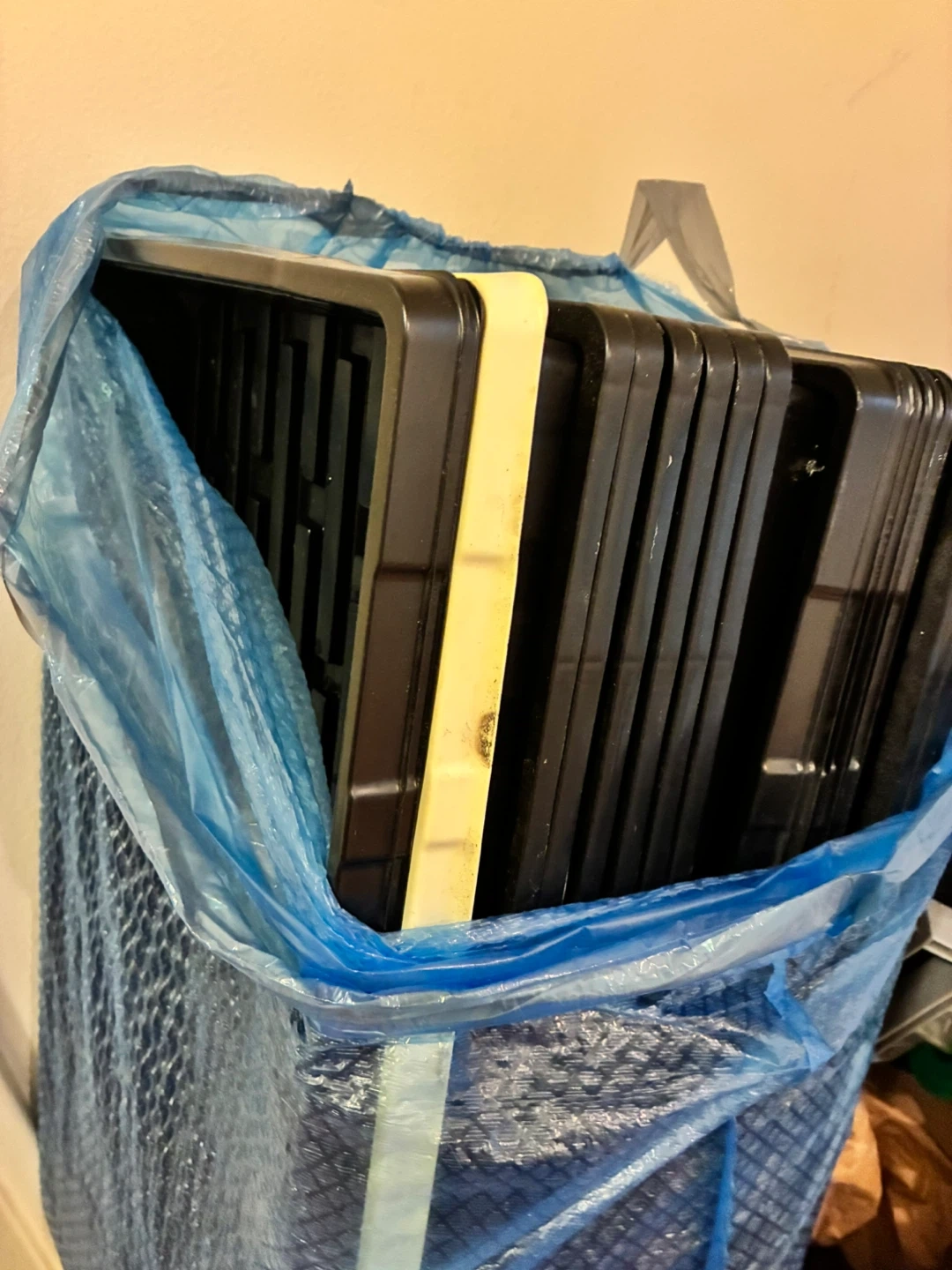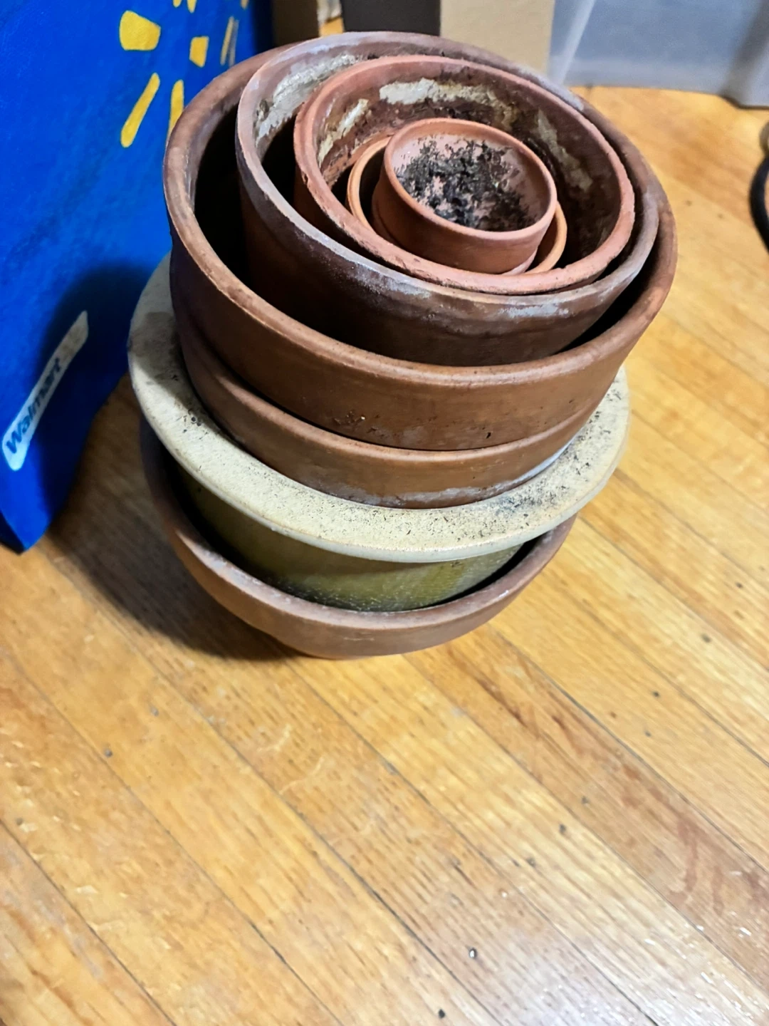 A bundle of hydroponic gardening supplies — seedling trays, organic fertilizers, and a wide variety of assorted pots.. from seedling starter trays, tiny pots through larger pots in plastic, stoneware and terracotta.