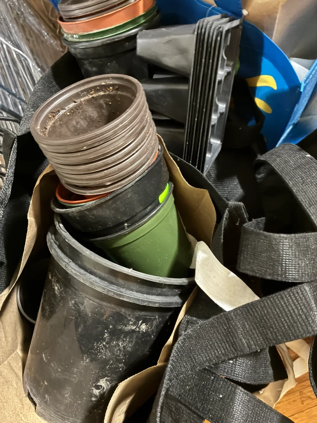 A bundle of hydroponic gardening supplies — seedling trays, organic fertilizers, and a wide variety of assorted pots.. from seedling starter trays, tiny pots through larger pots in plastic, stoneware and terracotta.