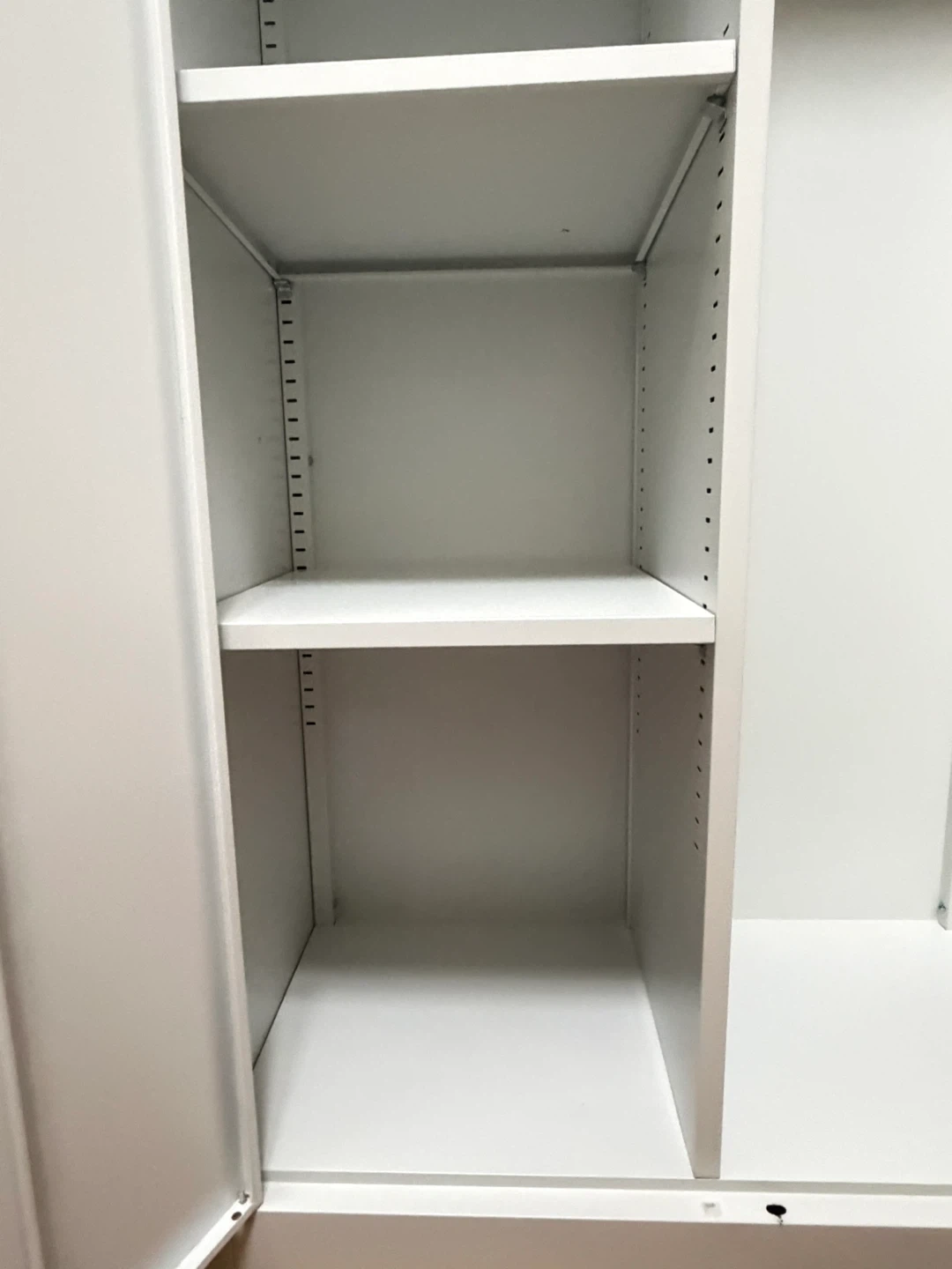This is a white metal storage cabinet. It features multiple adjustable shelves and a hanging rod for clothes. The cabinet has double doors with a latch closure. Great for organizing garages, offices, or closets!