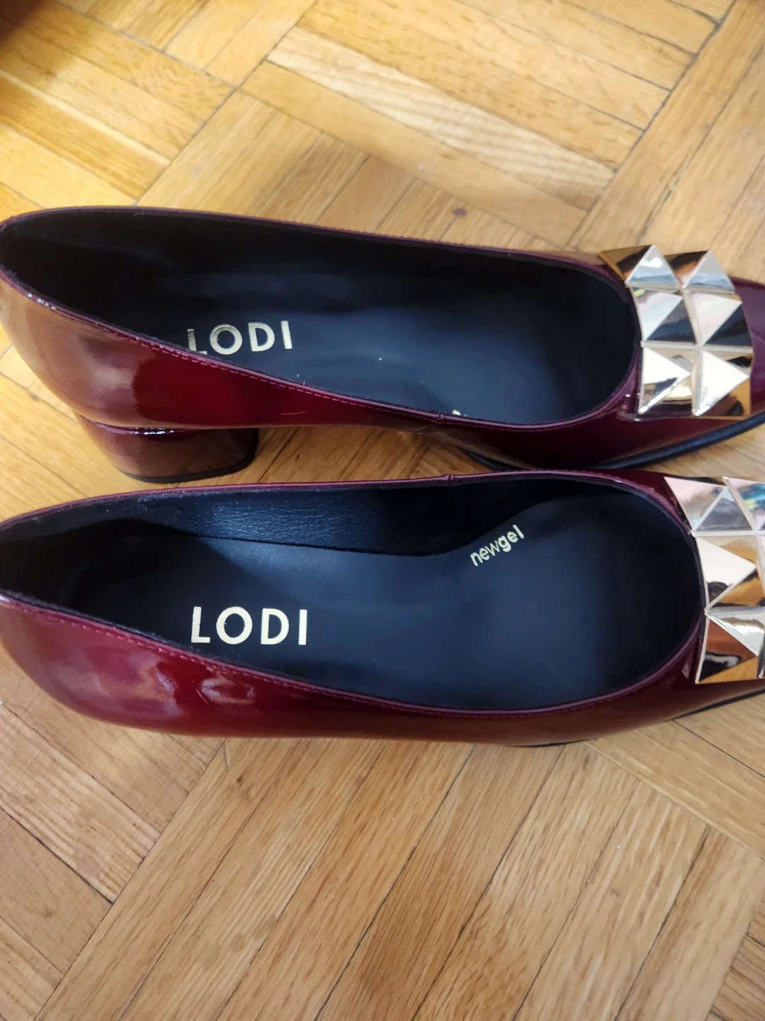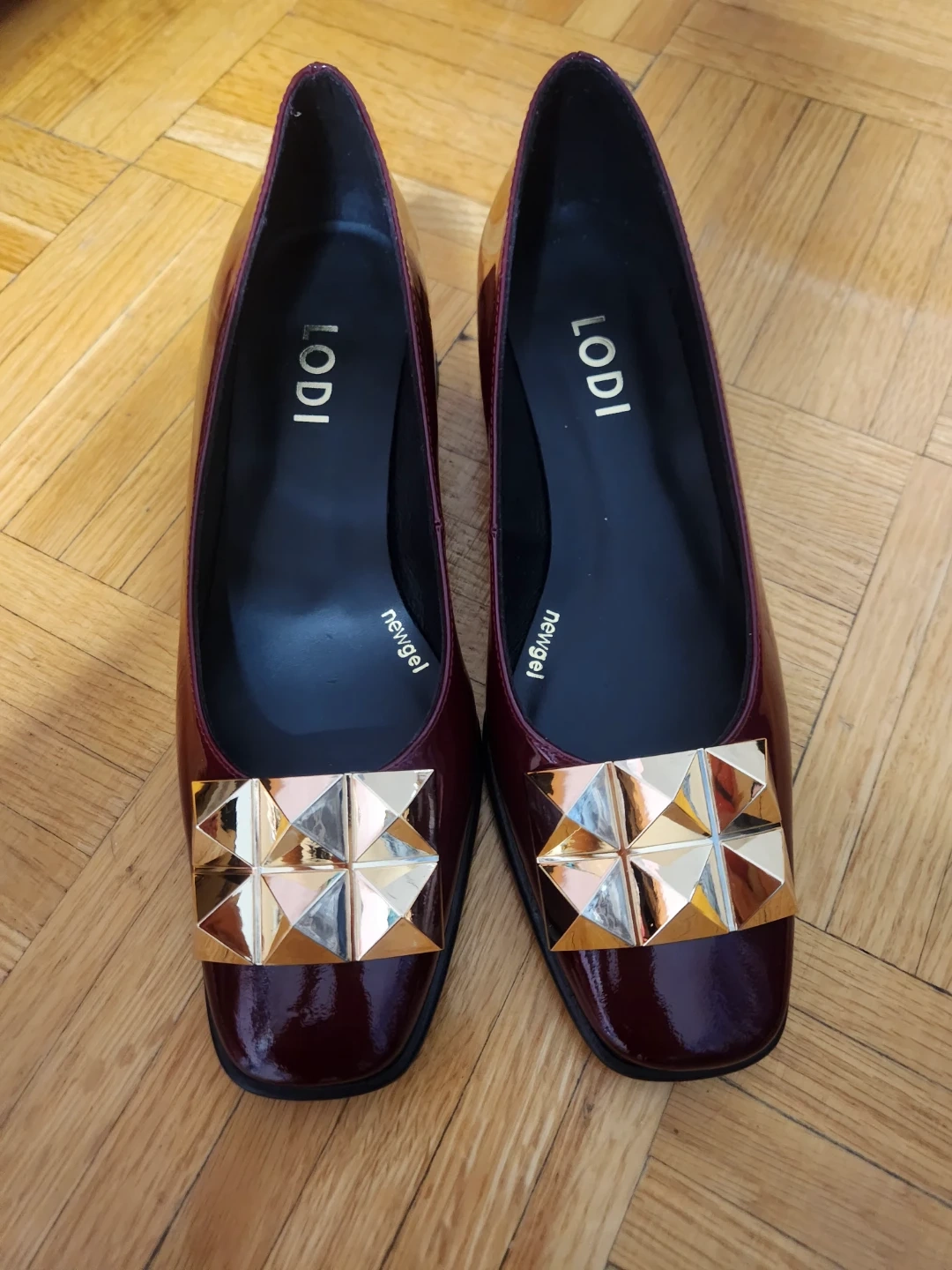 These burgundy Lodi heels feature a glossy patent leather finish. They're adorned with a striking gold-toned geometric embellishment across the toe. Includes 'newgel' comfort insole.