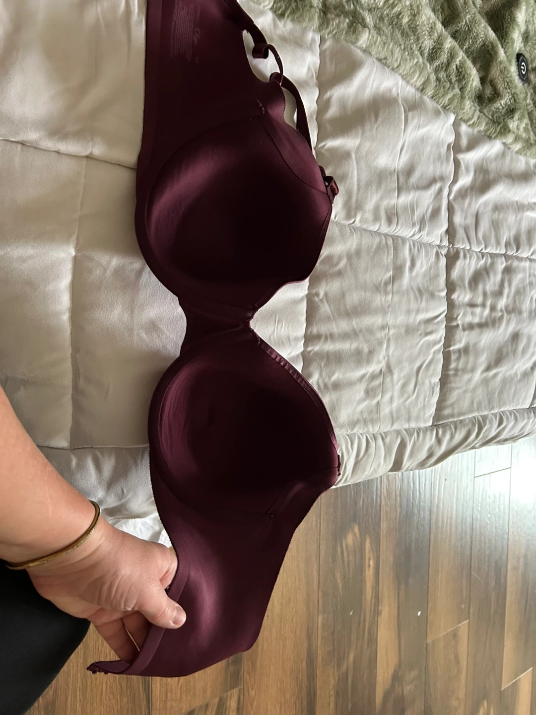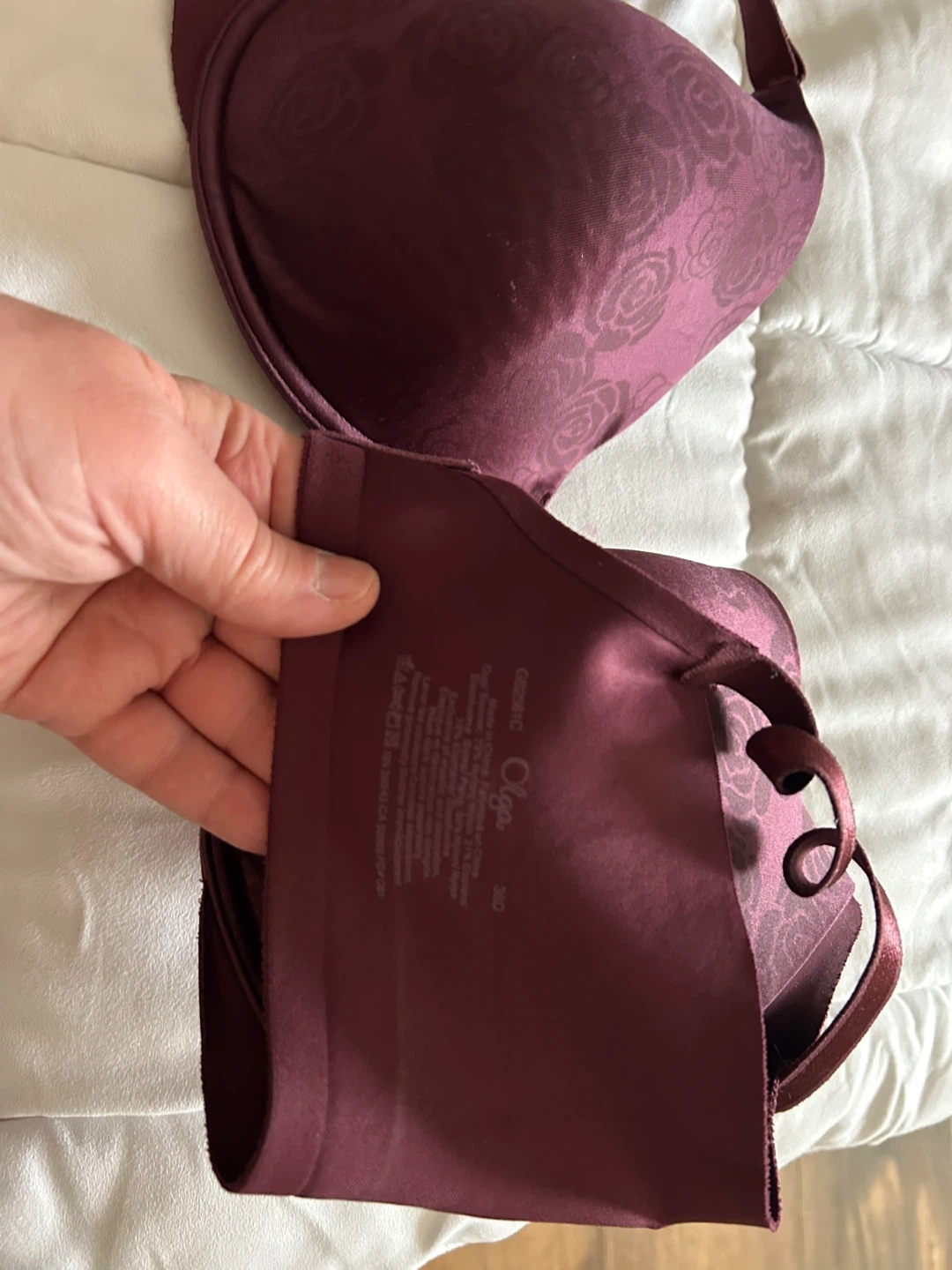This is an Olga by Warner's bra in a 36D size. It's a lovely burgundy colour with a subtle floral pattern on the cups. The bra is made of a smooth satin-like material.