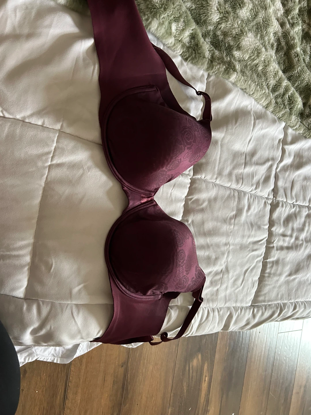 This is an Olga by Warner's bra in a 36D size. It's a lovely burgundy colour with a subtle floral pattern on the cups. The bra is made of a smooth satin-like material.