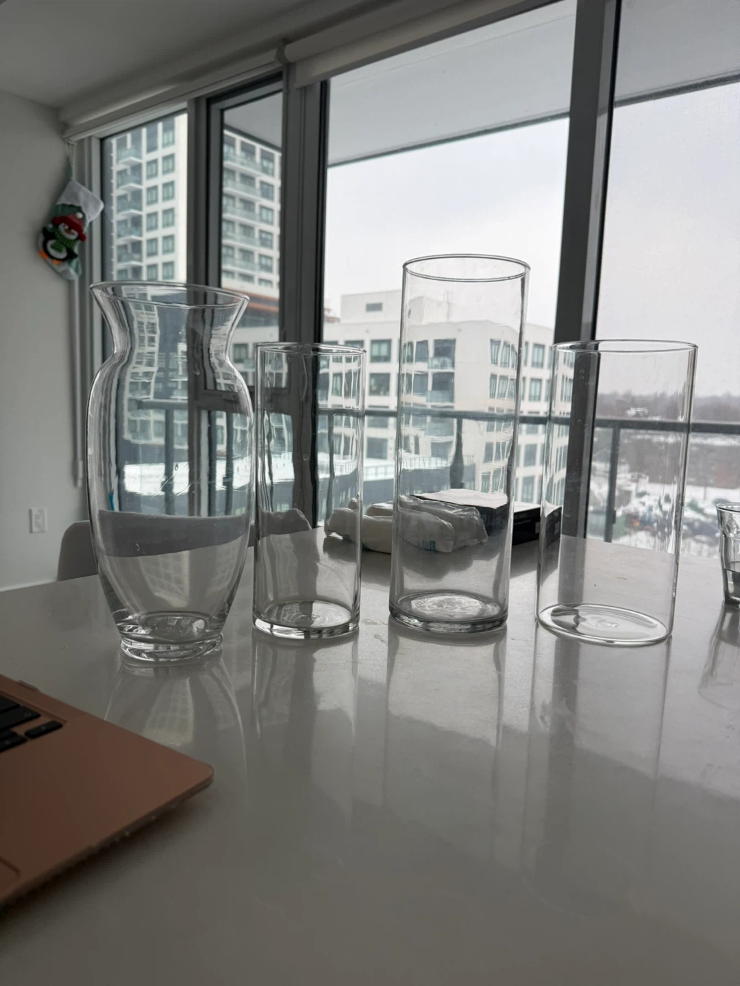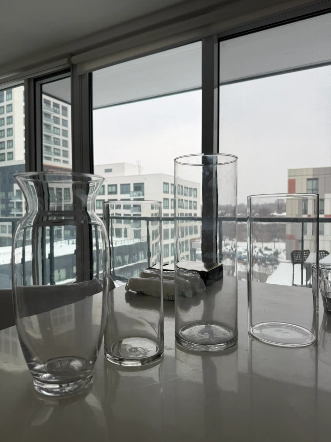 This set includes four clear glass vases of various heights and shapes. One vase has a classic urn-style opening, while the others are cylindrical. They're made of clear glass, perfect for displaying flowers.
