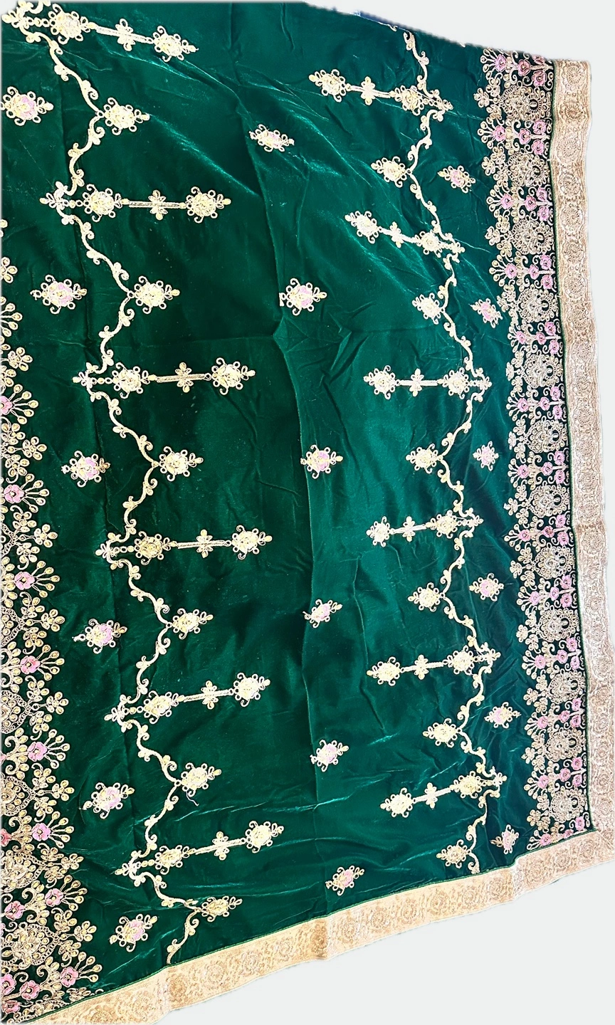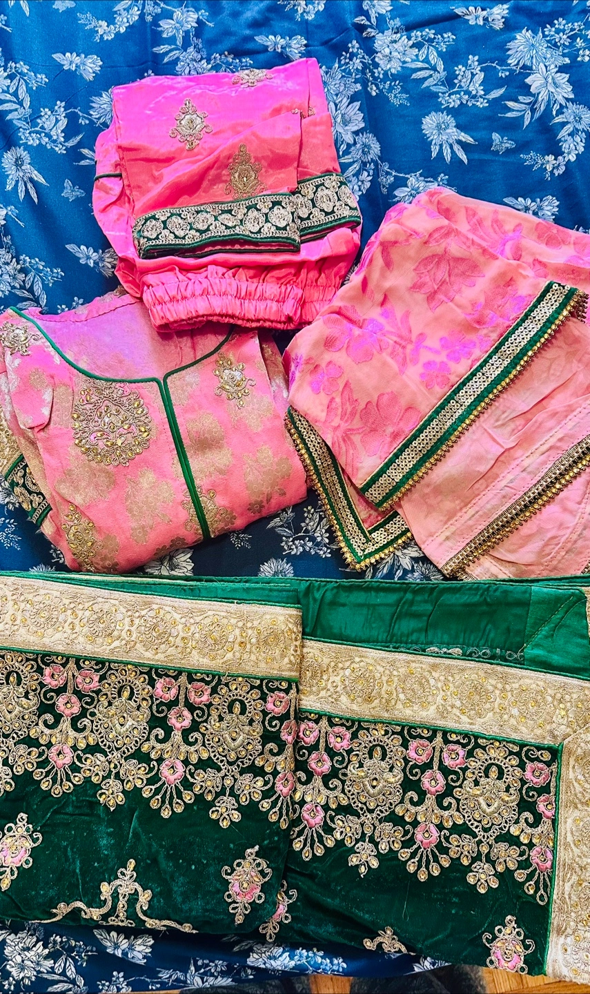 Beautiful pink and green salwar kameez with intricate embroidery. Perfect for a special occasion or cultural event! The set includes the kameez (top), salwar (pants), and a stunning green velvet shawl and pink matching dupatta with matching embroidery.