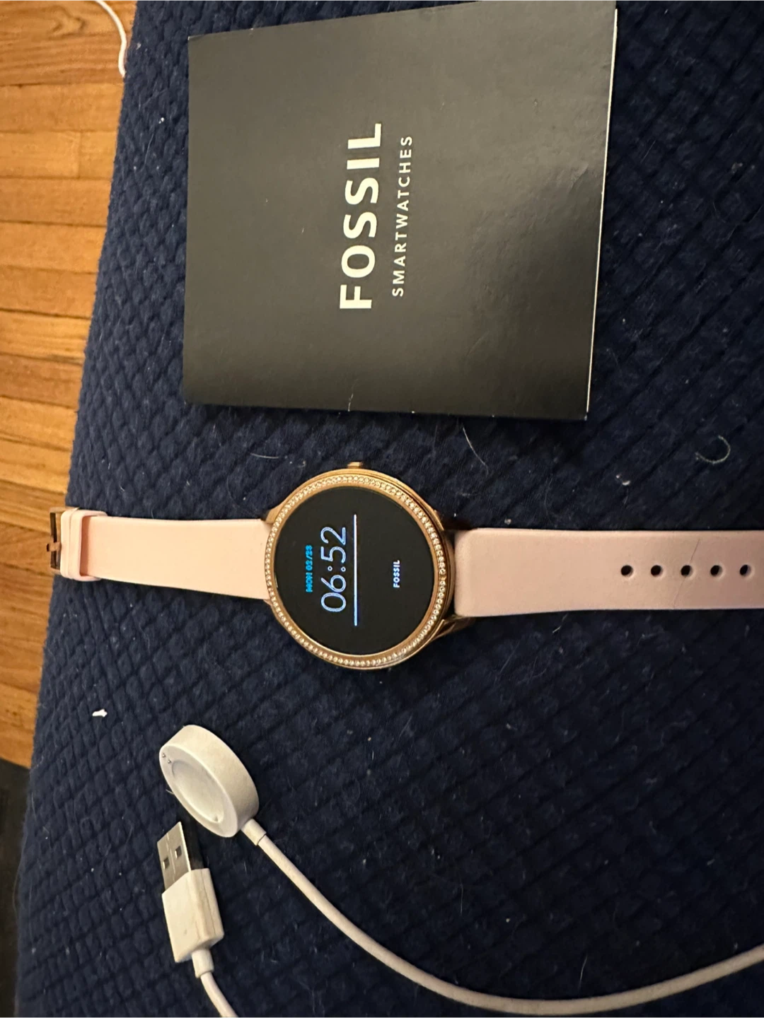 This is a Fossil smartwatch with a rose gold tone case and a pink silicone band. It includes the original charging cable. The watch face shows the time and date.