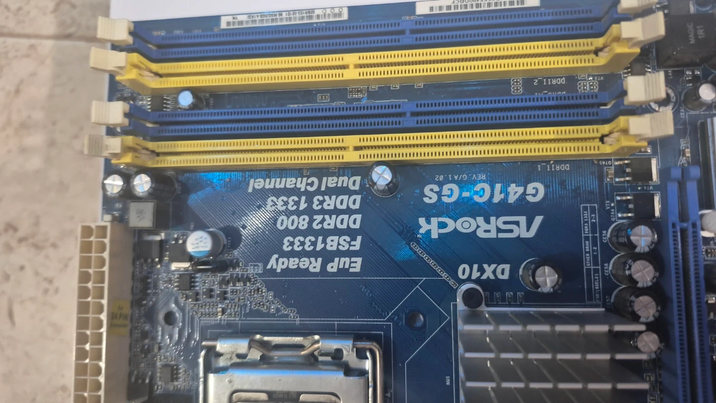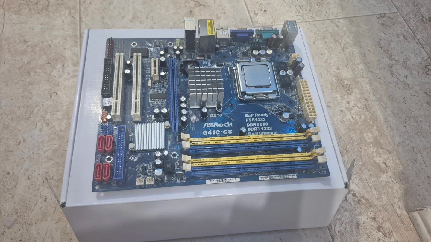 Selling an ASRock G41C-GS motherboard. It supports DDR3 1333 and DDR2 800 Dual Channel memory. It comes with the box and i have no idea its will still works i clean it up as best i could with care if you have proper tools then its all yours and oh it comes with cpu