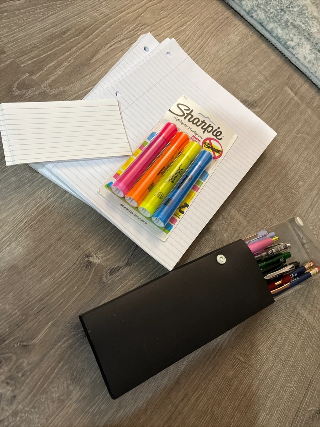 Includes stack of college ruled loose leaf (about 2 packs), handful of index cards, brand new pack of Sharpie highlighters, and a pencil case with over 10 pens and pencils!