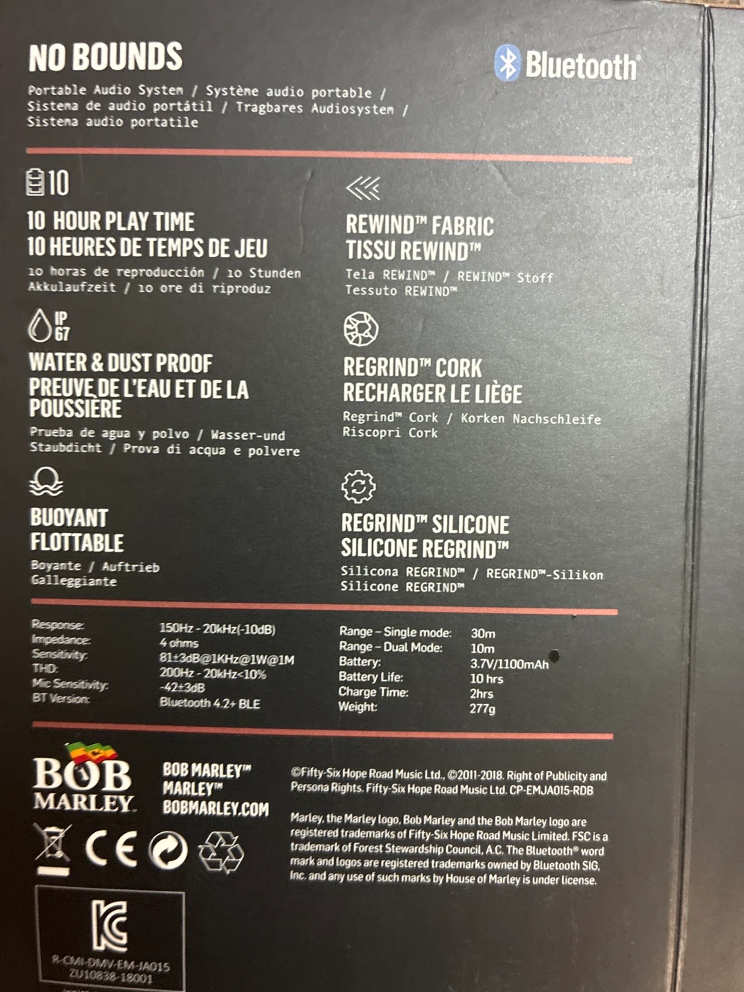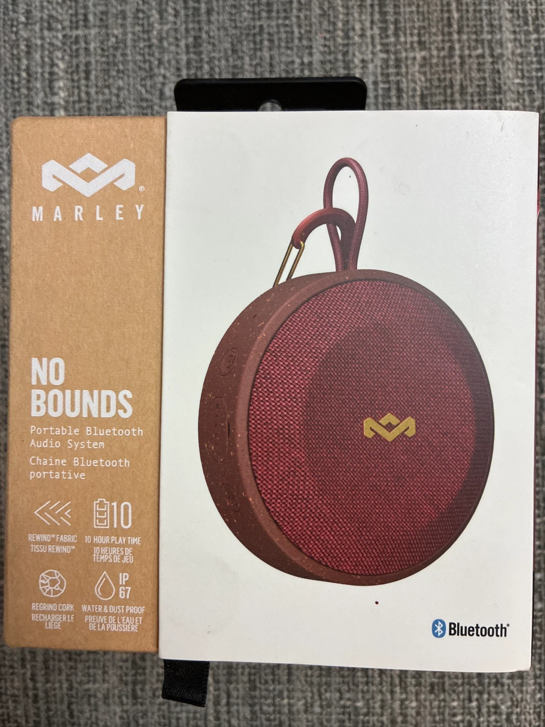 Selling a new Marley No Bounds portable Bluetooth audio system! It's water and dust proof with an IP67 rating. This speaker has a 10-hour play time and is made with rewind fabric and regrind cork. It's also buoyant and floatable!