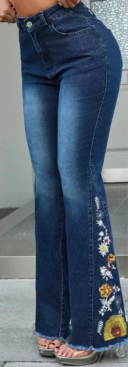 Dark wash denim flare jeans with colourful floral embroidery on the outer seams. Features a frayed hem. Denim material. It's a stylish choice for adding some flair to your outfit!