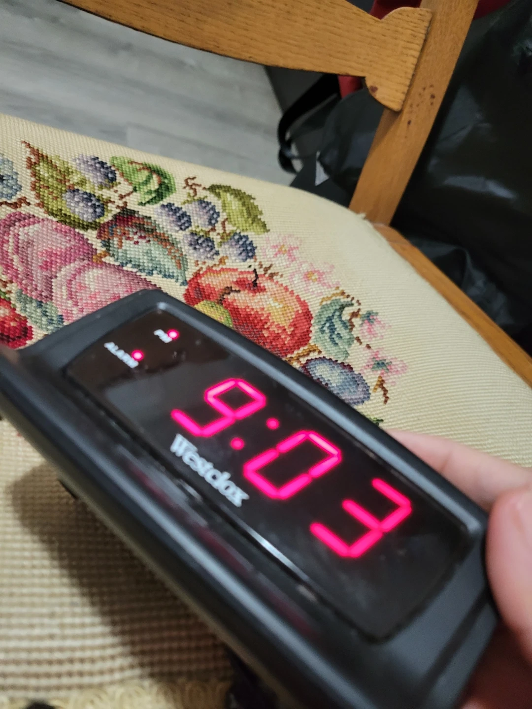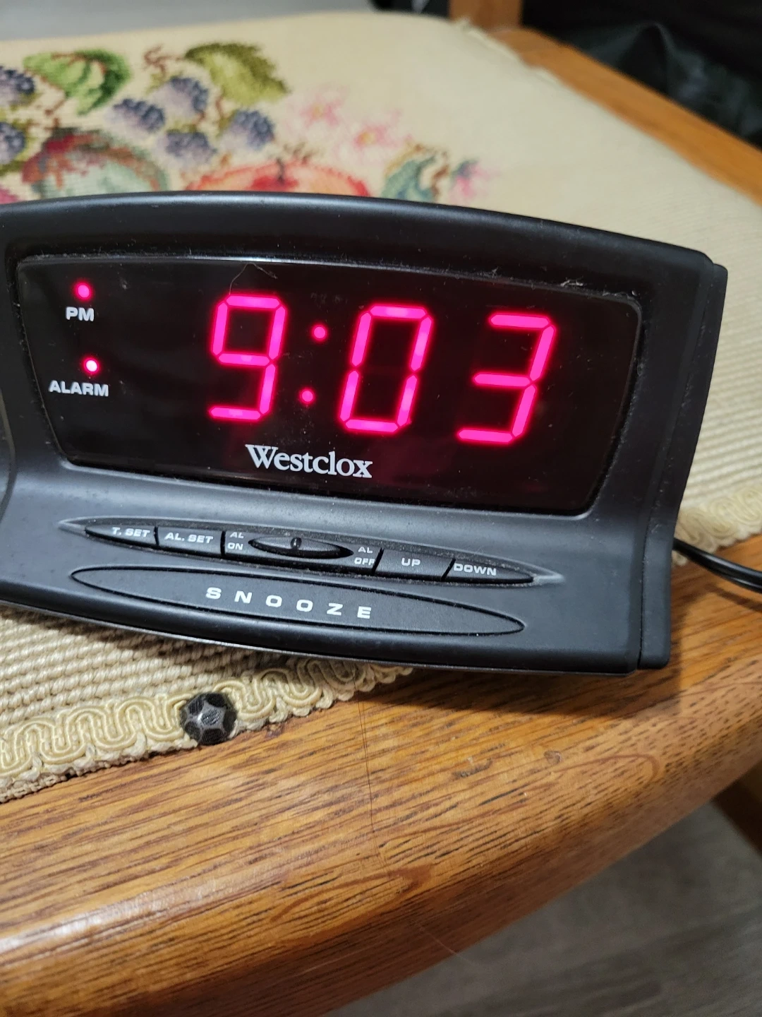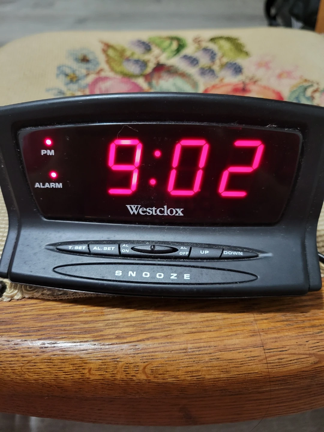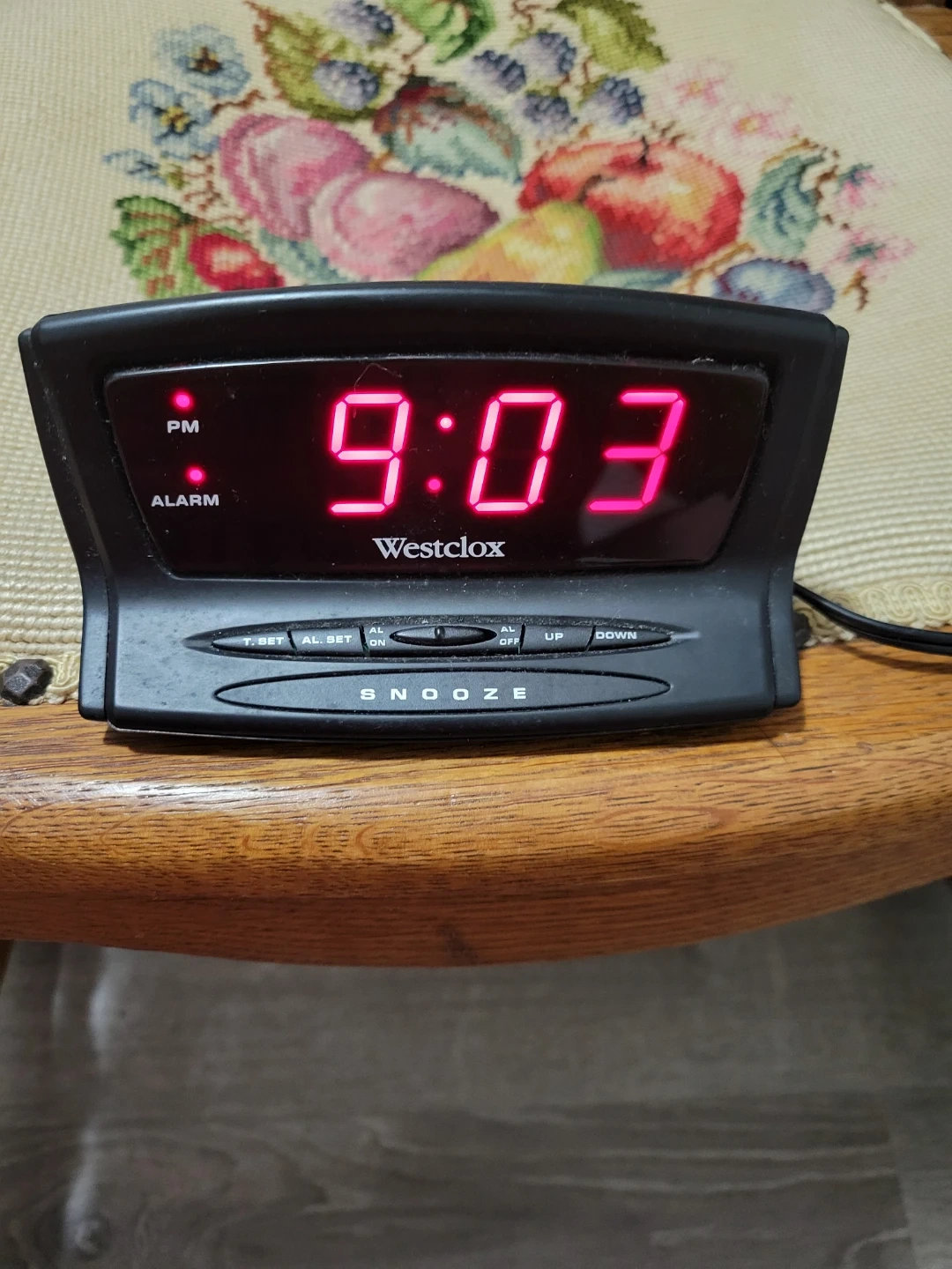 This is a Westclox digital alarm clock. It features a bright red LED display with PM indicator. The clock has a snooze button and controls for alarm and time setting.