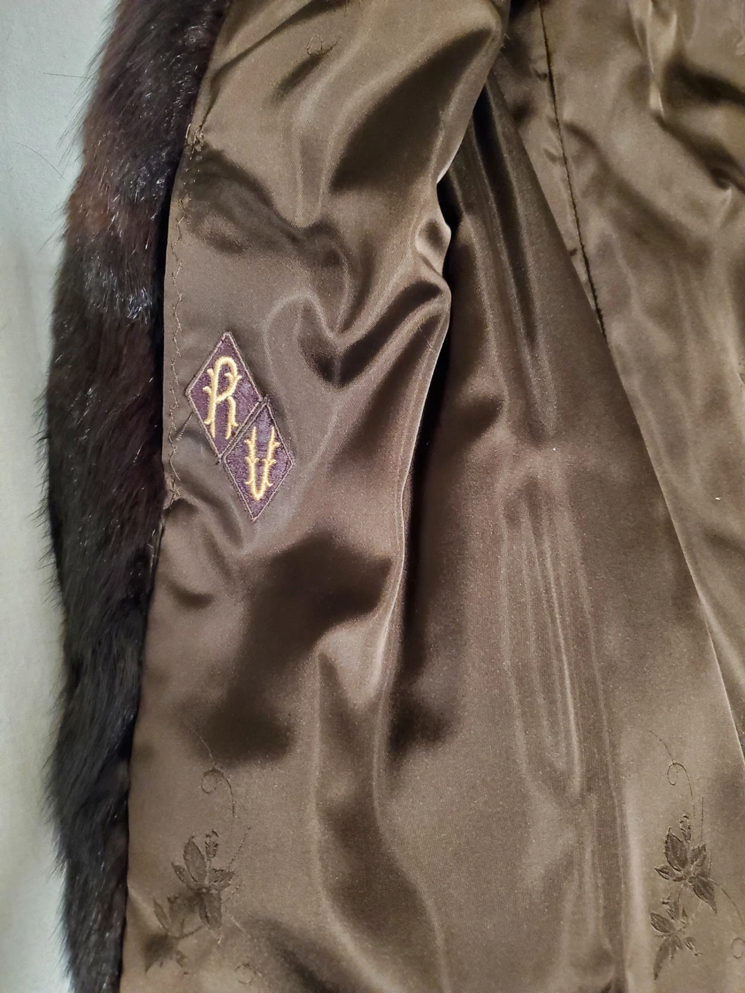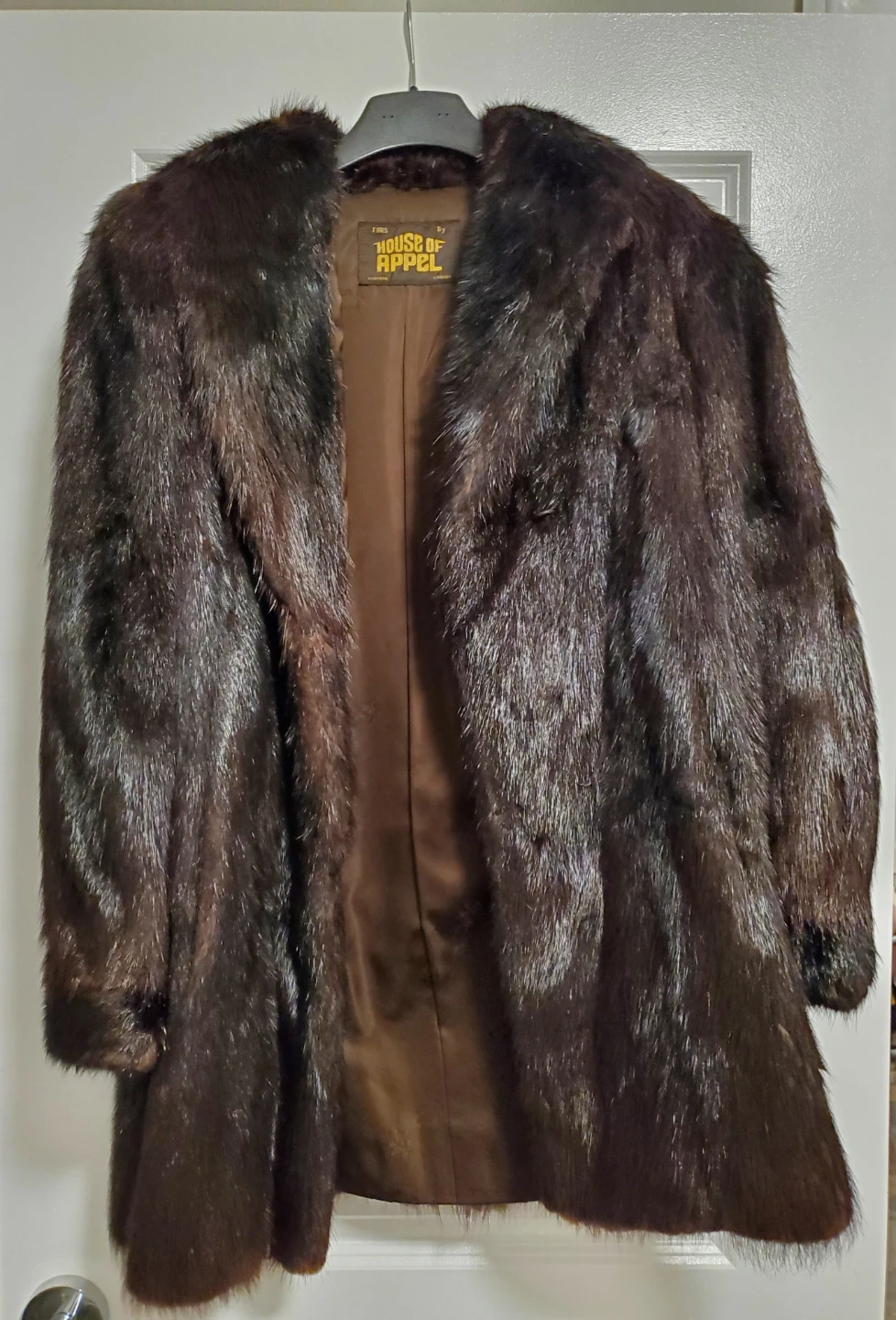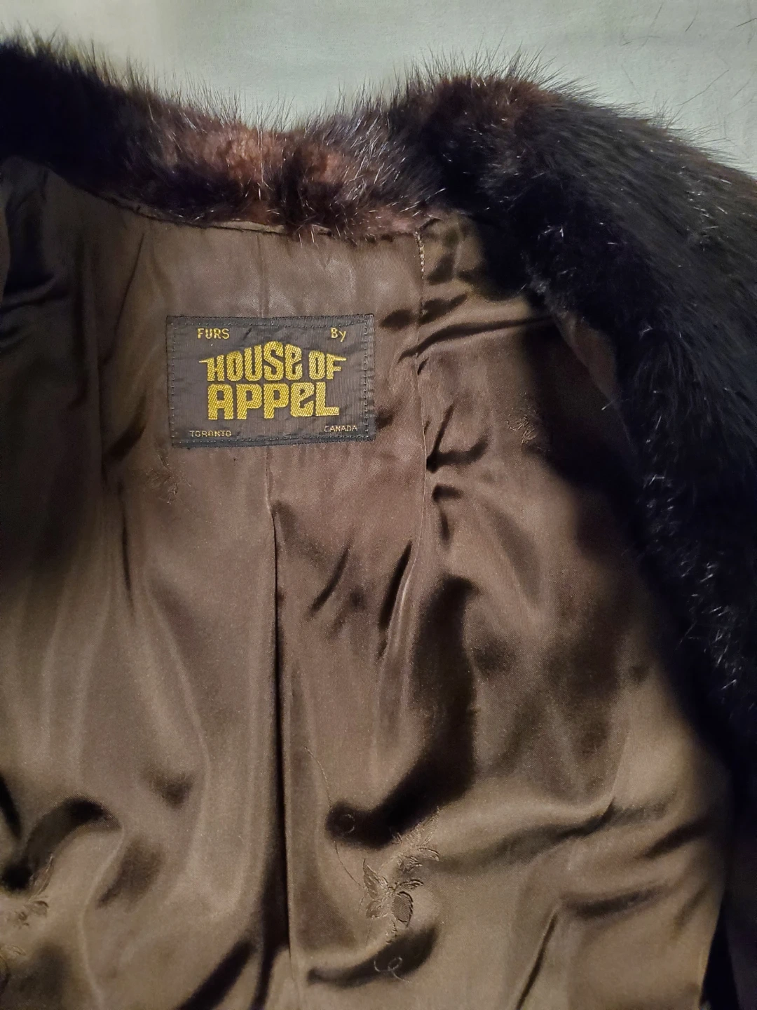 House of Appe furl coat, made in Toronto, Canada. Features a rich brown fur exterior and a smooth satin lining. Two extrior hidden outer pockets with an inside right pocket. This coat offers stylish warmth for cooler weather.