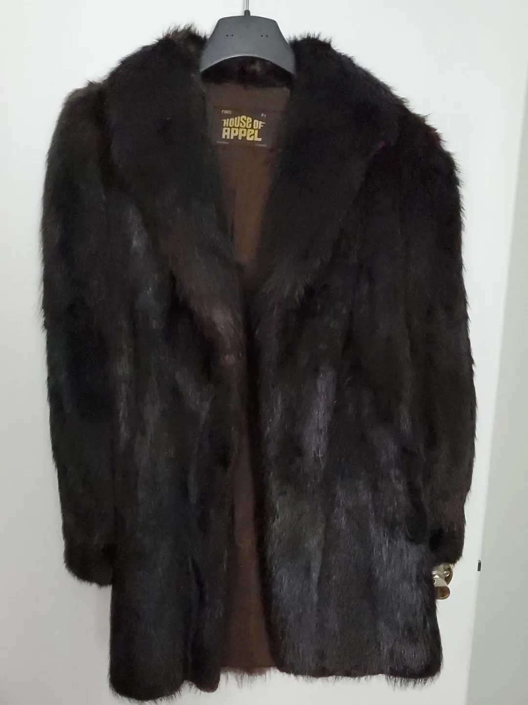 House of Appe furl coat, made in Toronto, Canada. Features a rich brown fur exterior and a smooth satin lining. Two extrior hidden outer pockets with an inside right pocket. This coat offers stylish warmth for cooler weather.