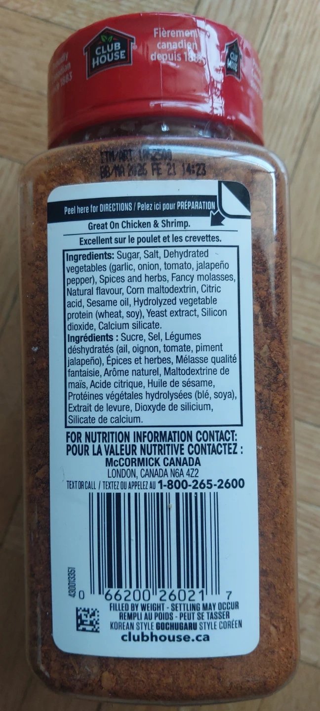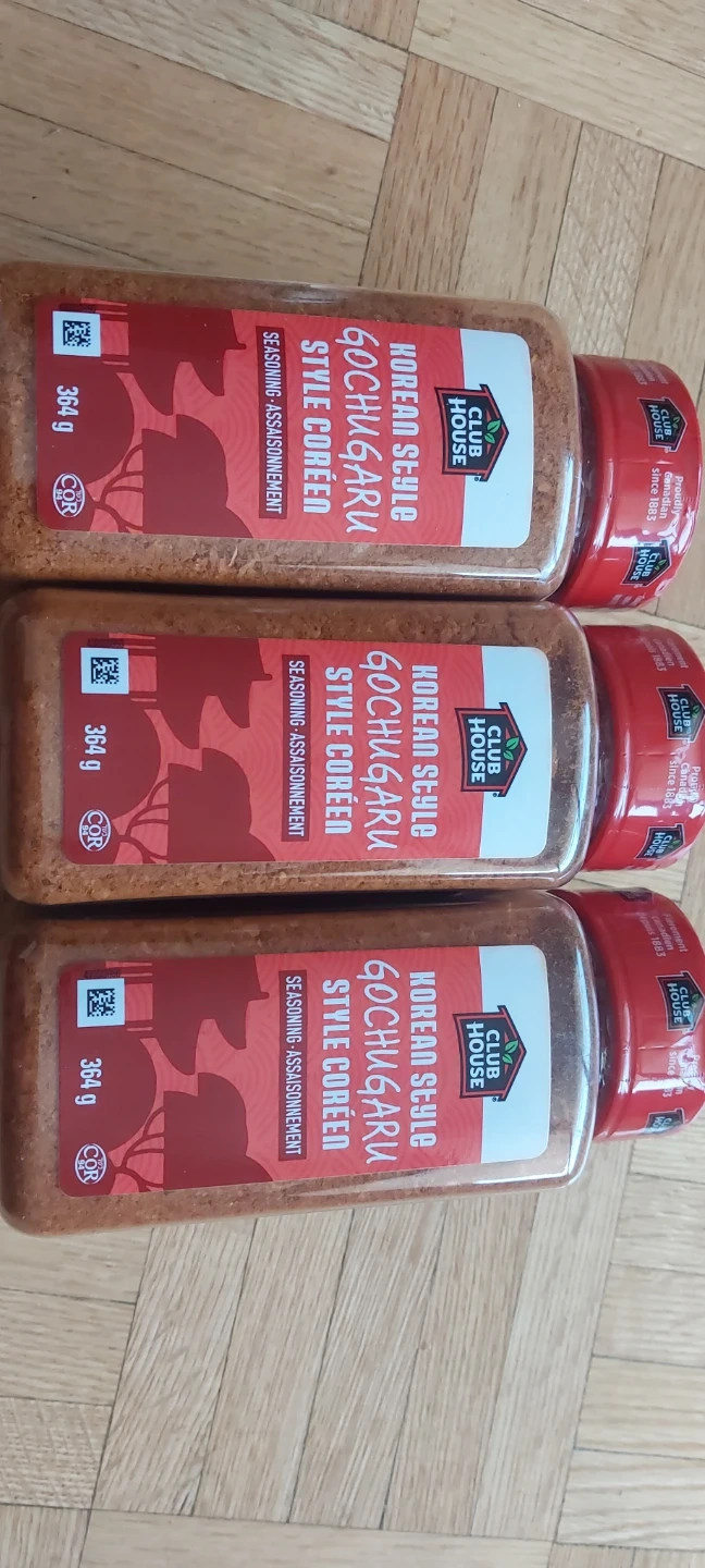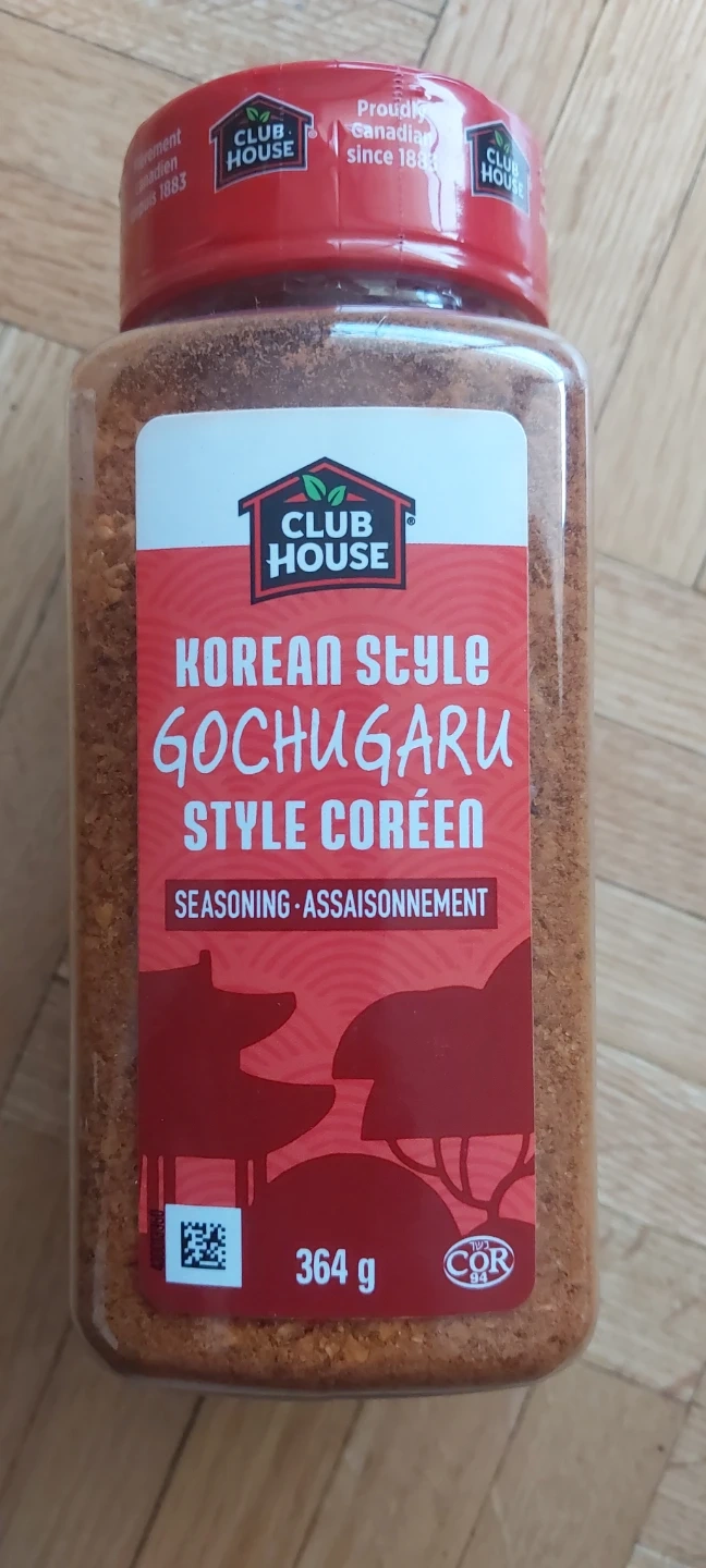 This is Club House Korean Style Gochugaru Seasoning. It's a seasoning blend perfect for adding Korean flair to your dishes. Made with sugar, salt, and dried vegetables, it's great on chicken and shrimp! It weighs 364g.