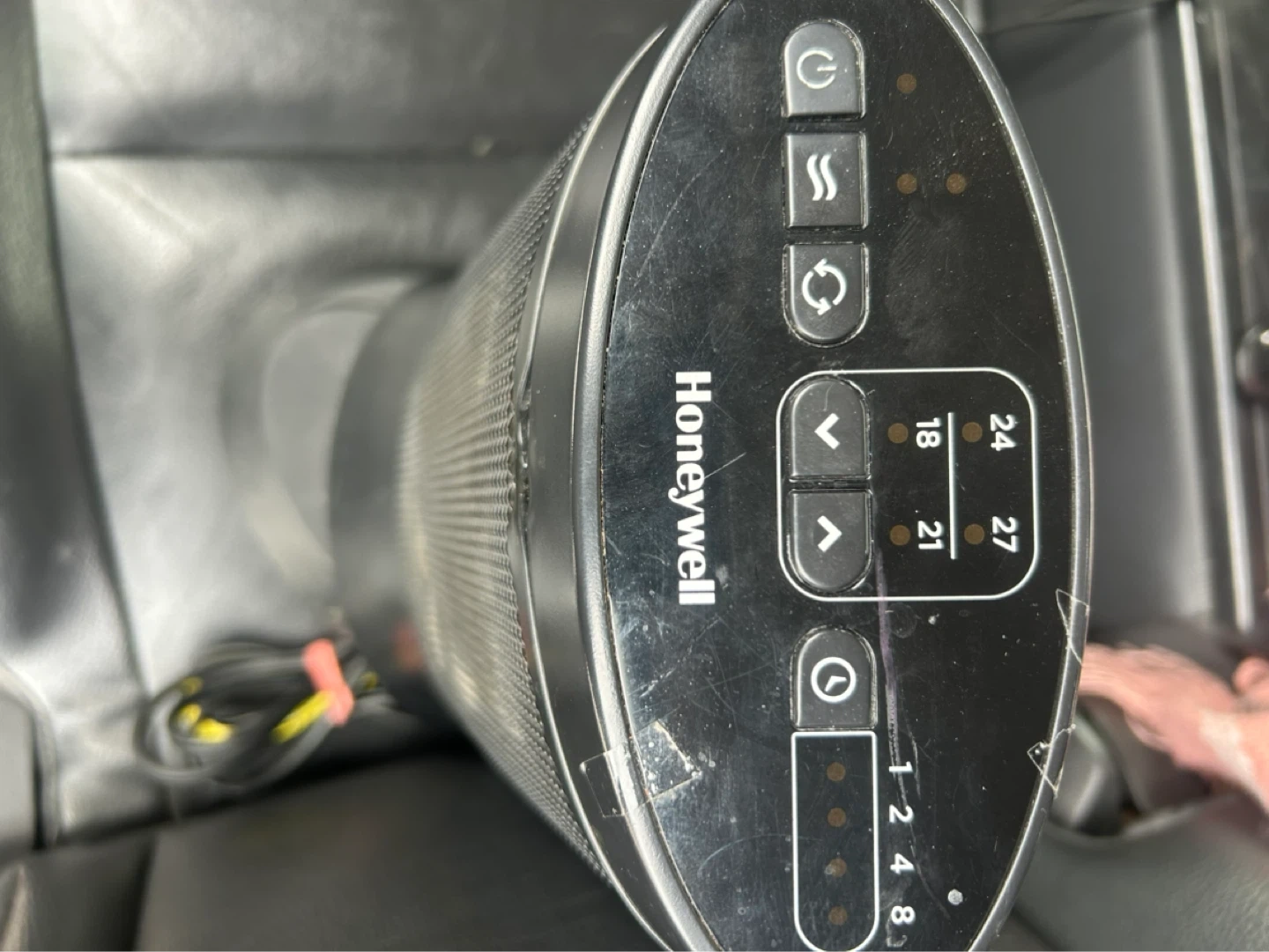 This is a Honeywell personal heater. It features multiple heat settings and a timer function. It's black and compact for easy placement.