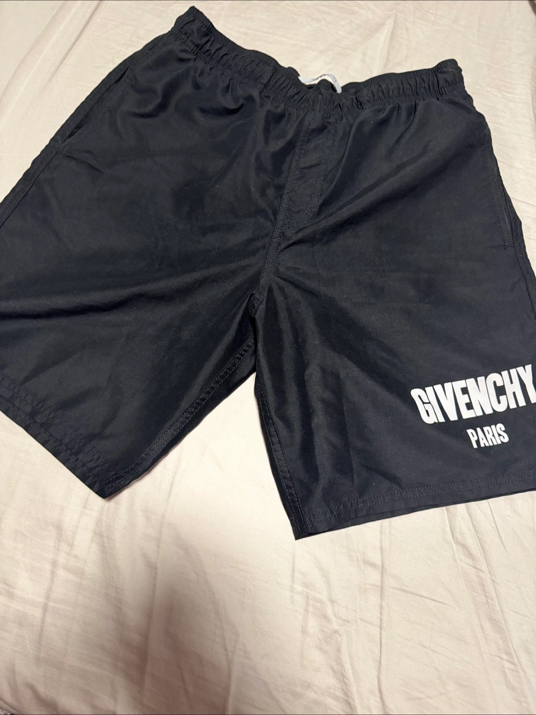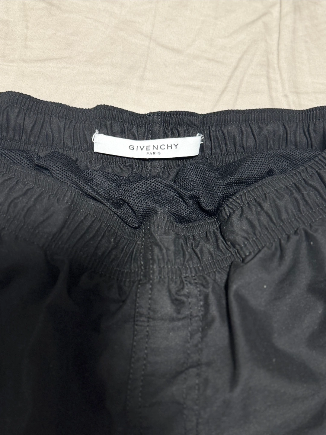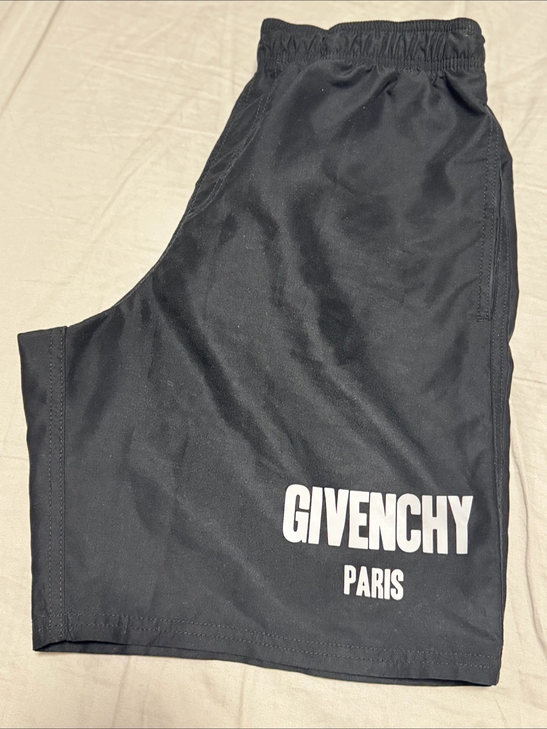 Men's black swim trunks. Size large. Features Givenchy Paris logo. 100% polyester. Made in Portugal.