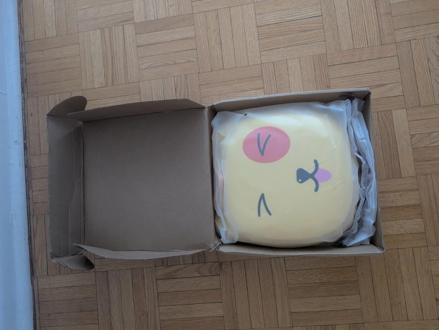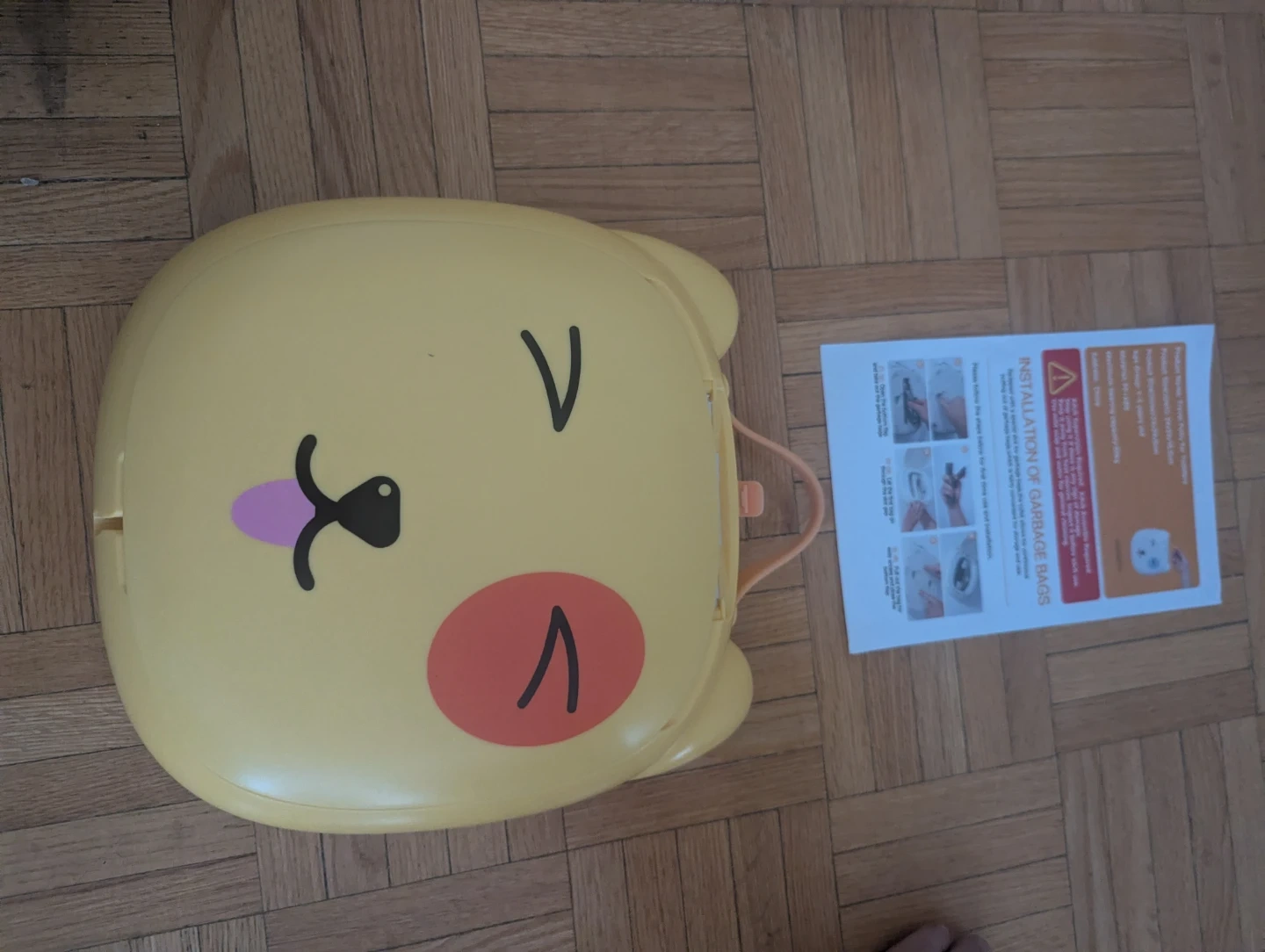 This is a cute yellow portable potty seat designed for children. It's made of plastic and features a fun animal face design. It comes with instructions for use.