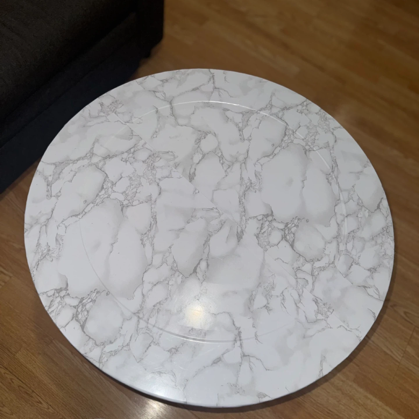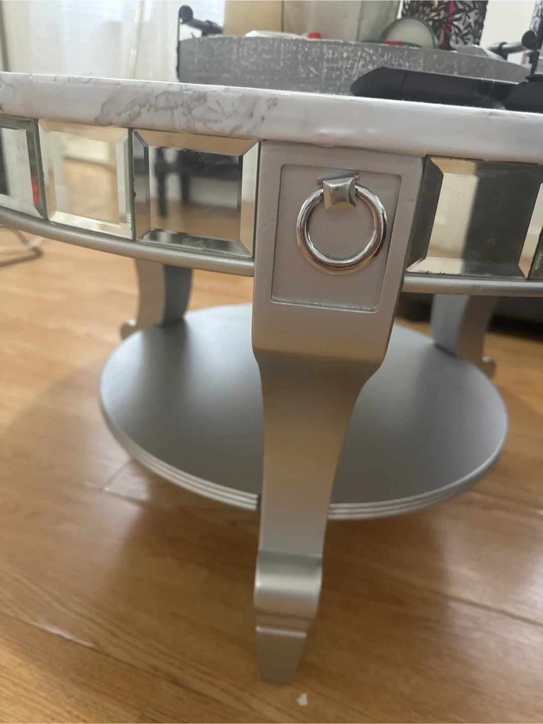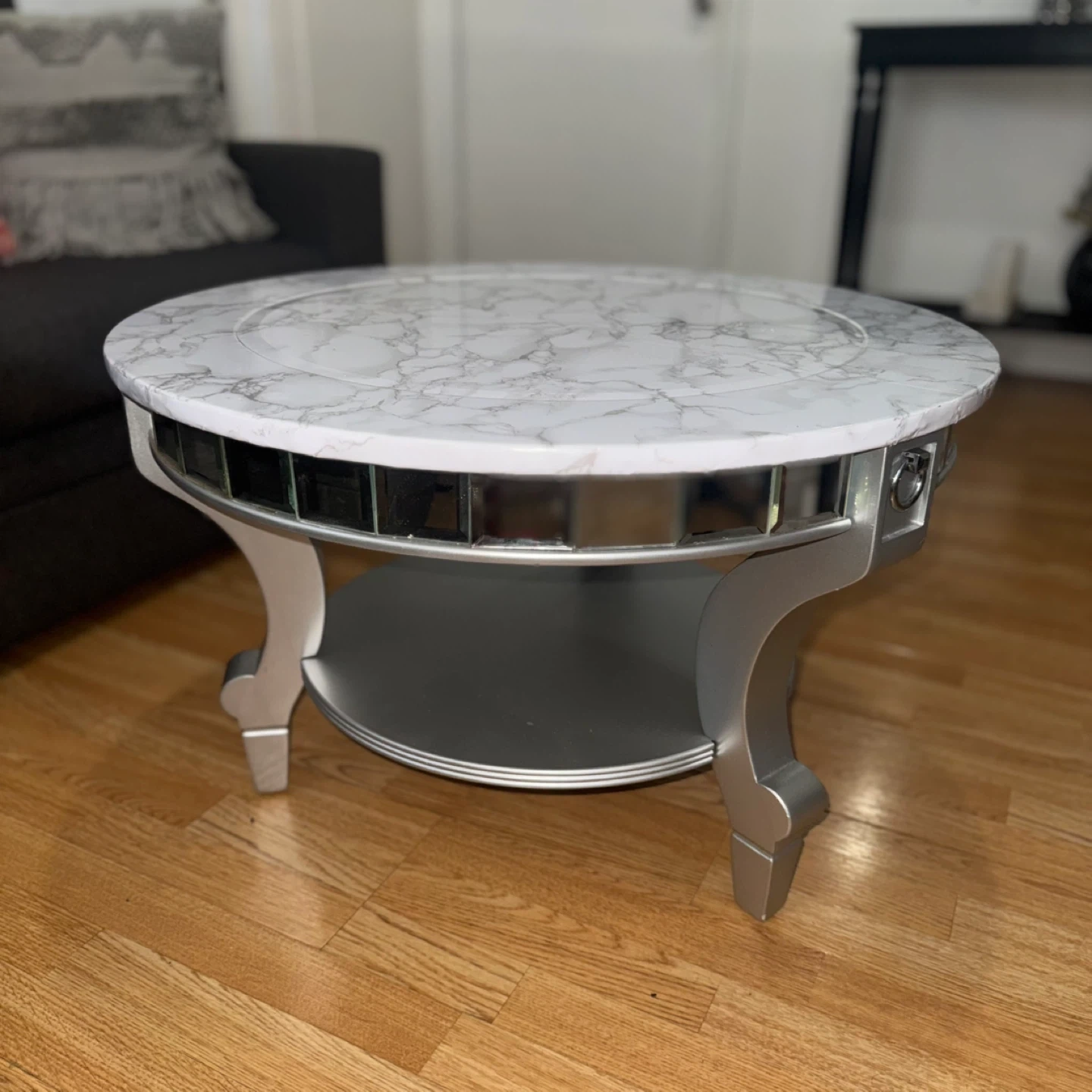 This round coffee table features a marble-look top and decorative mirrored accents around the edge. It's got a lower shelf for extra storage. The silver-toned legs offer a classic design. A stylish addition to any living room! The top its wrapped with laminated paper, under it is mirrored.