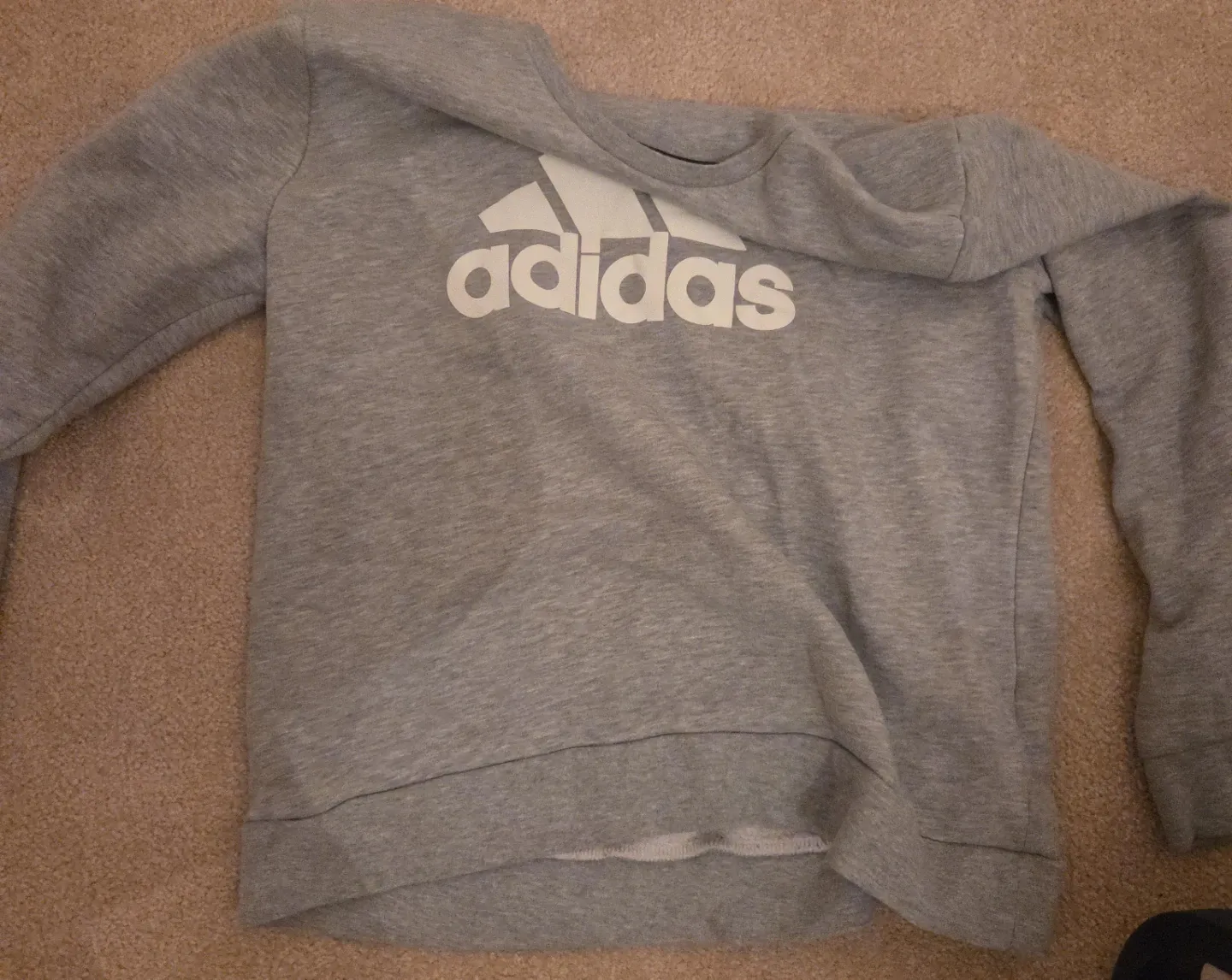 A comfy grey crewneck sweatshirt with the classic Adidas logo. It's made from a soft cotton blend. This sweatshirt is suitable for everyday wear.