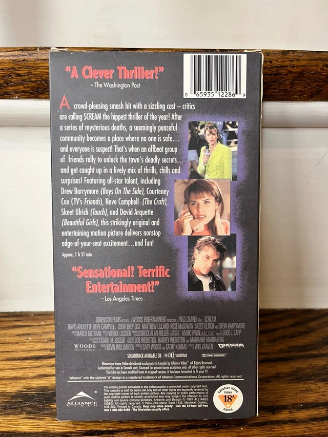 Selling a VHS copy of the classic horror film Scream. This is a used copy, but it's in good condition for its age. A must-have for any horror fan's collection! This thriller will have you on the edge of your seat! I tested it and for some odd reason the tape starts about 4-5 seconds into the first scene of the movie. Maybe a factory authoring or duplication error. It’s authentic and the movie plays fine. Slip cover is in nice condition. Check out my other listings for more cool stuff!
