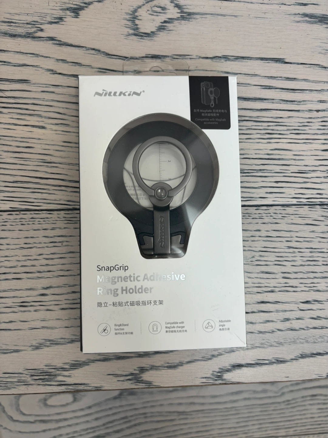 SnapGrip Magnetic Adhesive Ring Holder for phone. This ring holder also functions as a stand and includes a lanyard hook. Package content includes the ring holder and an assistive align card.